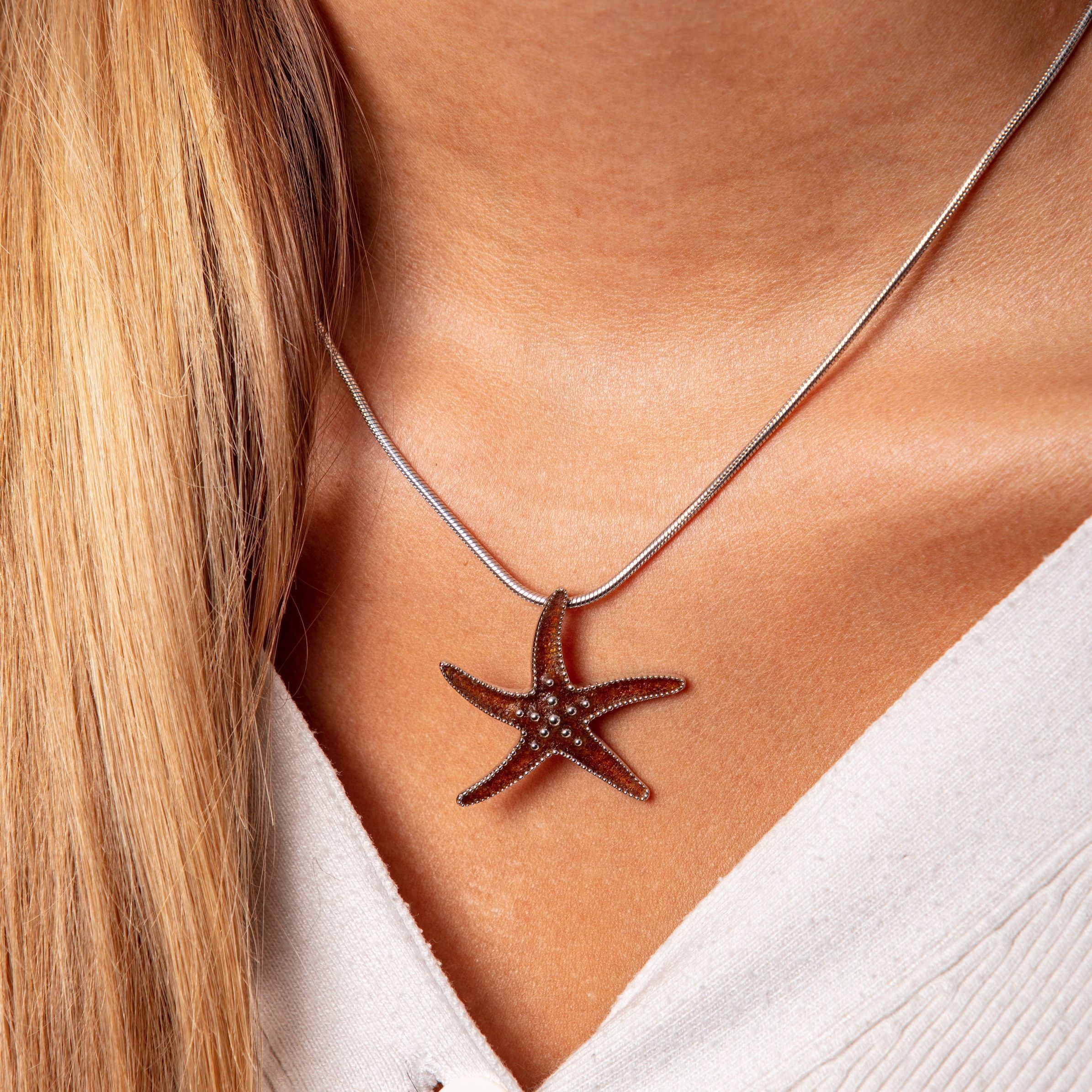 In Form eines fein gearbeiteten Seesterns verzaubert der Anhänger mit seinem klaren, glänzenden Design und einer Füllung aus echtem Bernsteinsand. Kleine, detailreiche Silberkügelchen verzieren die Oberfläche und lassen das Schmuckstück dezent funkeln – wie das Glitzern der Sonne auf den Wellen.