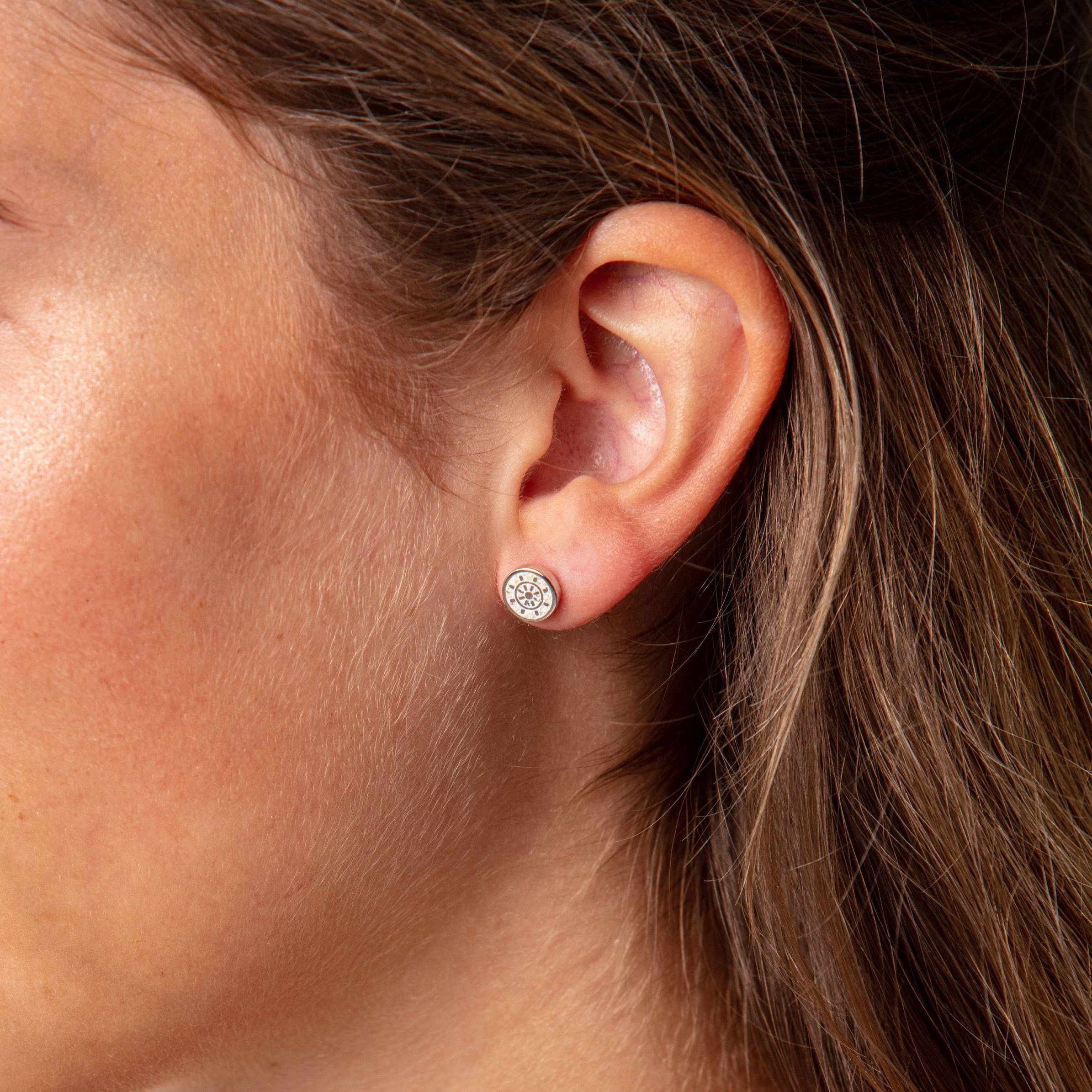 Die DUR Ohrstecker O5232 „Steuerrad“ sind ein stilvolles Schmuckstück mit maritimer Symbolik. Die kleinen, runden Ohrstecker mit einem Durchmesser von ca. 8 mm zeigen ein detailreiches Steuerrad, eingebettet in echten Strandsand.