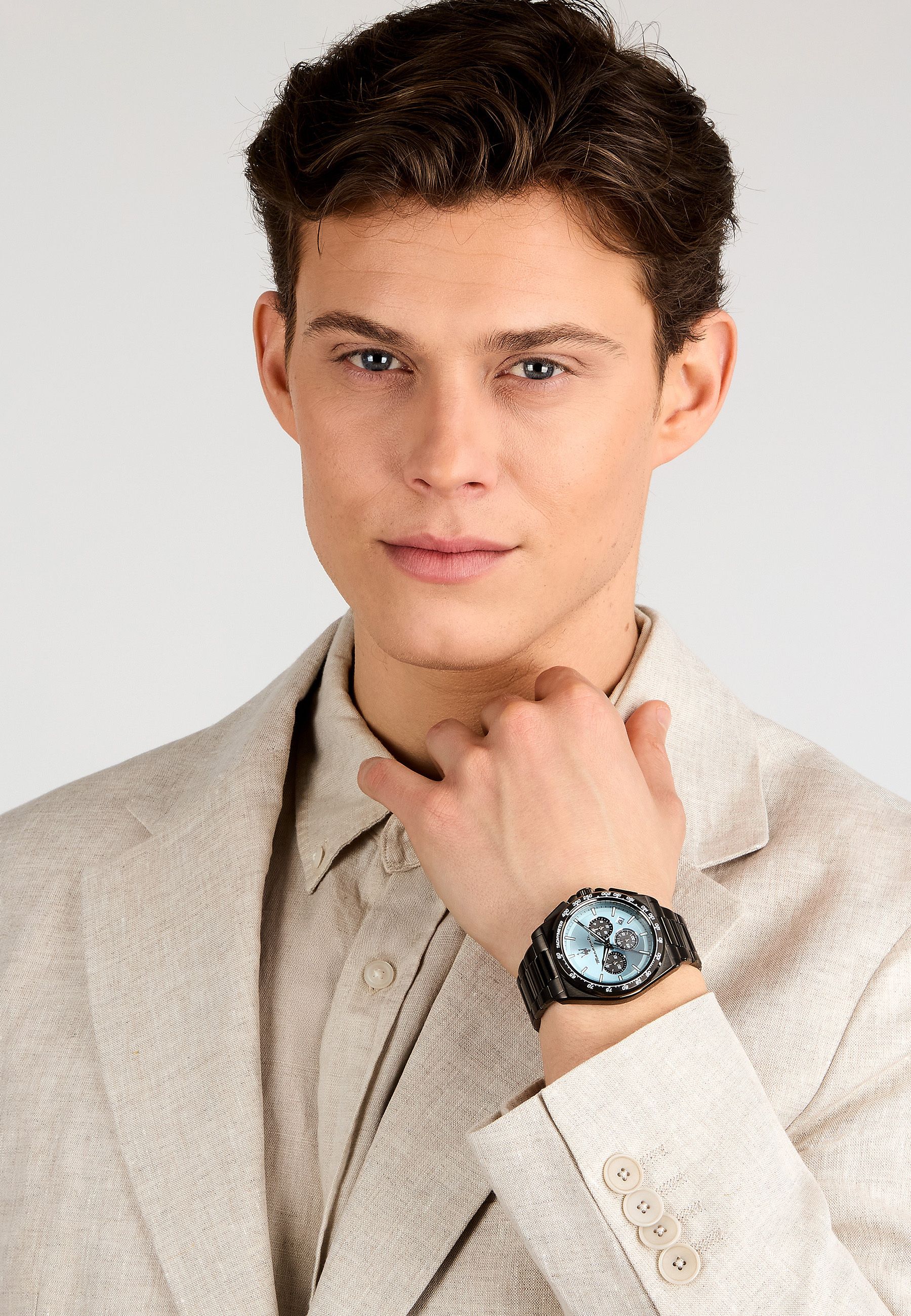 - Zifferblatt hellblau, Zeiger und Indexe gunmetalfarben