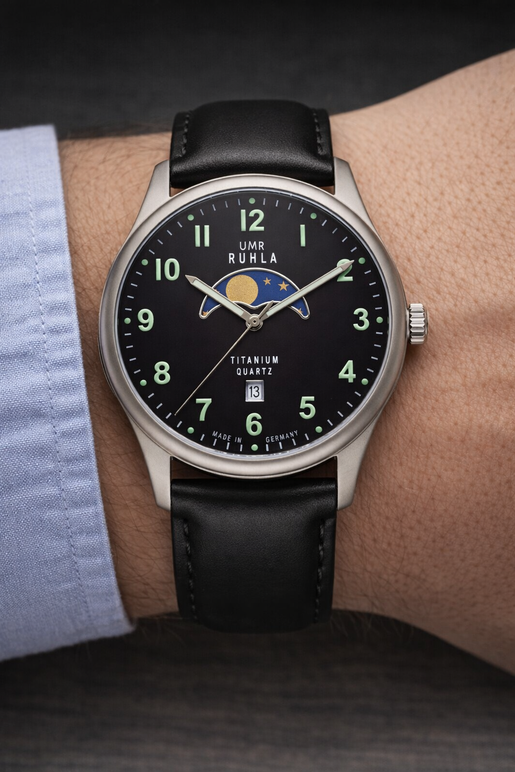 - Zifferblatt schwarz mit Mondphase, Indexpunkte und Ziffern nachleuchtend