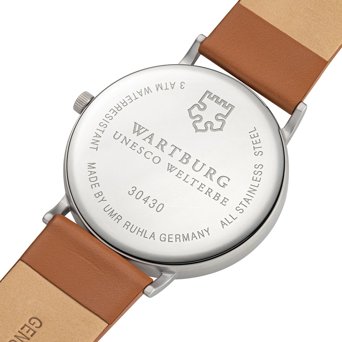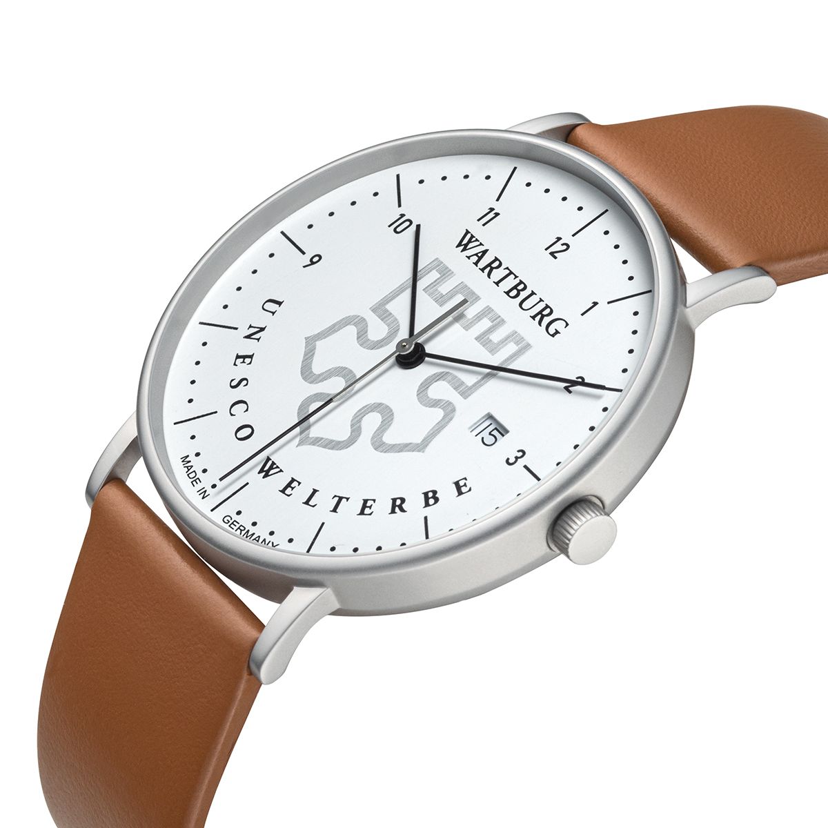 - Zifferblatt weiss mit silbernem Wartburg Logo und schwarzem Schriftzug