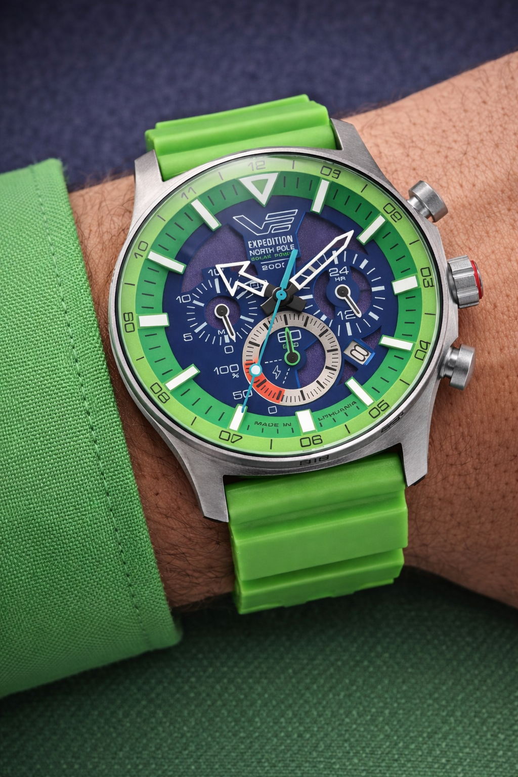 Die Vostok Europe Expedition North Pole Polar Spruce 595A733-L ist inspiriert von den Herausforderungen arktischer Expeditionen und vereint markantes Design mit moderner Solartechnologie.