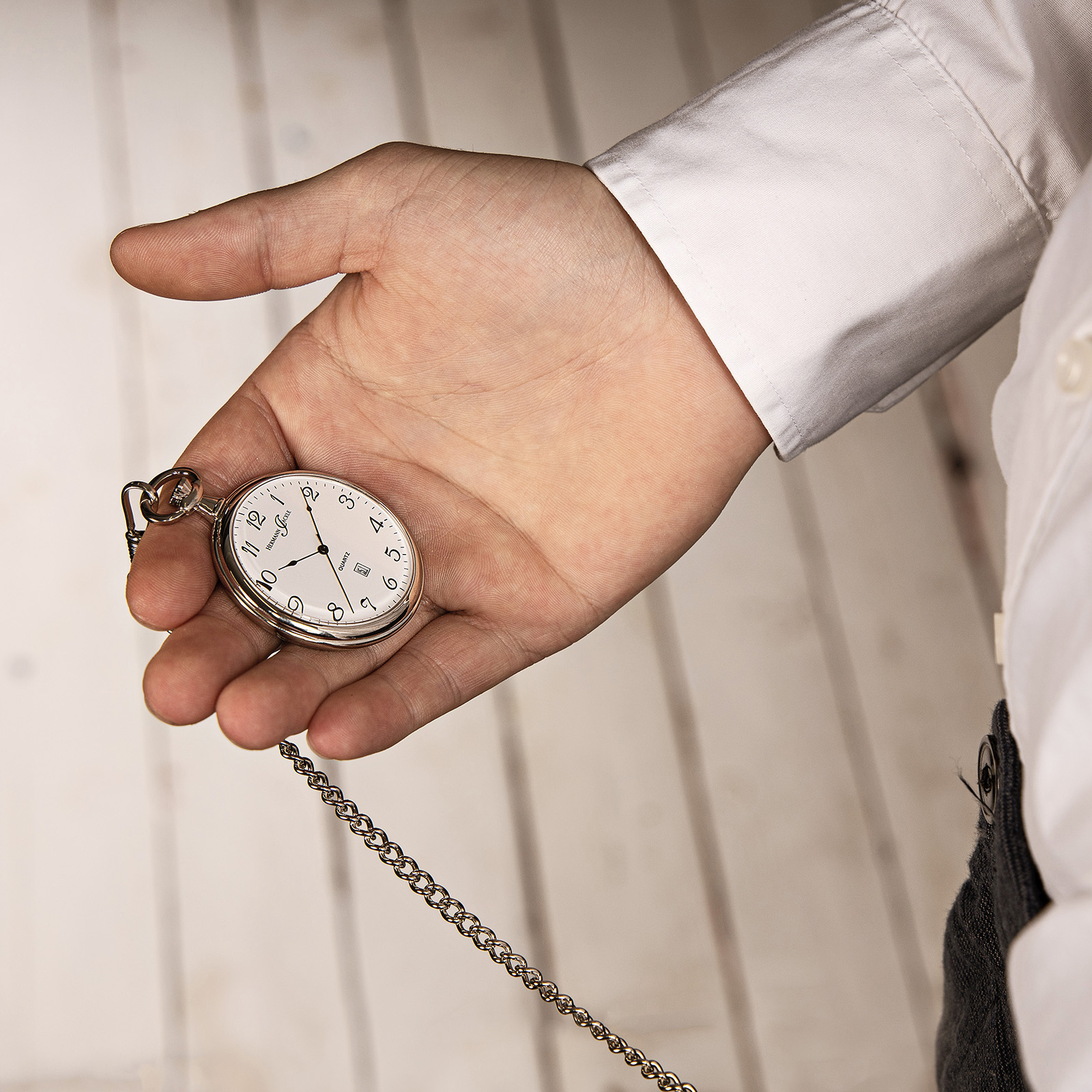 Die Hermann Jäckle Konstanz II verbindet funktionales Design mit zeitloser Eleganz. Das polierte, verchromte Messinggehäuse mit 47 mm Durchmesser verleiht dieser Taschenuhr eine markante und zugleich klassische Ausstrahlung.