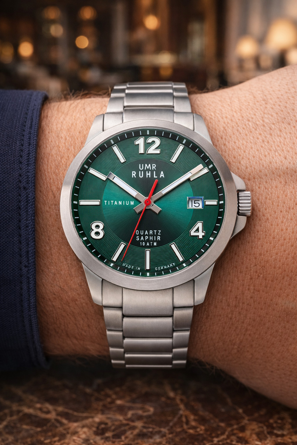 Die UMR Ruhla 32003 vereint modernes Design mit deutscher Präzision. Das satinierte Titangehäuse mit 40 mm Durchmesser sorgt für eine leichte, robuste und zugleich elegante Erscheinung am Handgelenk.
