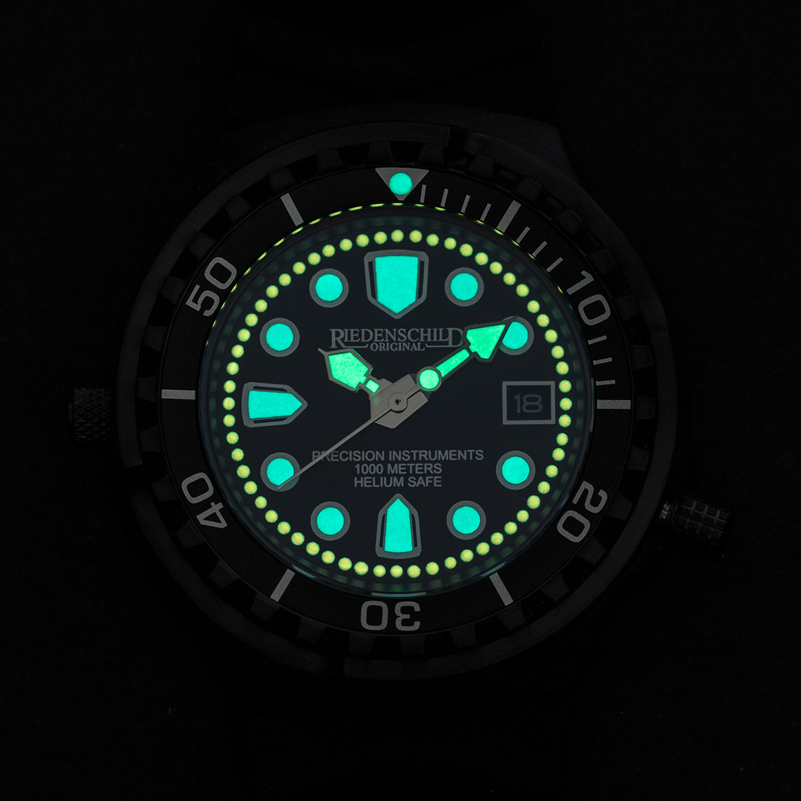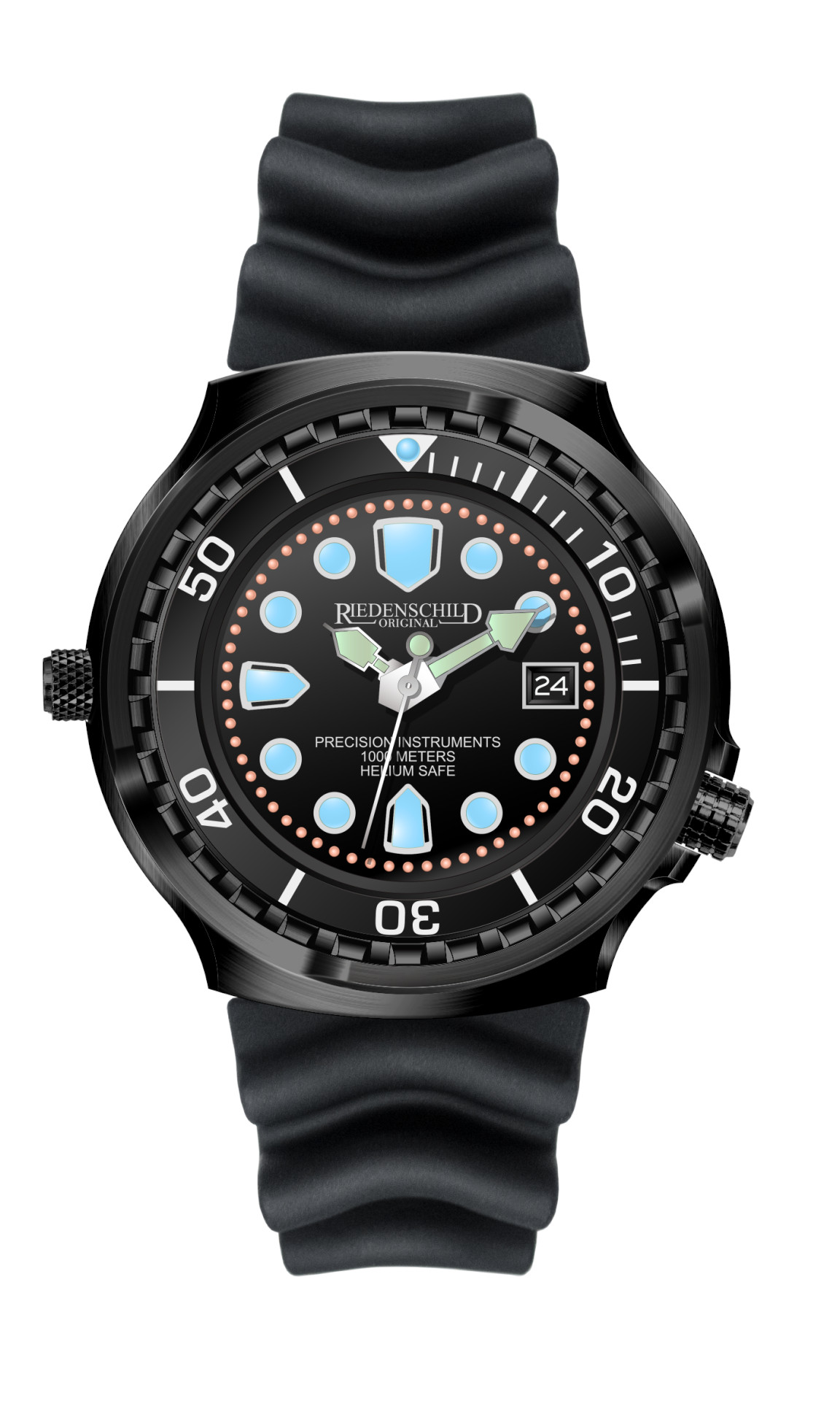 Sportliche Taucheruhr von Riedenschild mit Datumsanzeige. Das IP-schwarze Gehäuse ist aus rostfreiem Edelstahl gefertigt und hat eine einseitig drehbare Lünette. Die Indizes und Zeiger sind mit einer stark fluoreszierenden Masse bestückt. Das verbaute entspiegelte Saphirglas überzeugt durch seine besondere Härte und Widerstandsfähigkeit. Eine leistungsstarke Batterie treibt das ganggenaue Quarzuhrwerk aus dem Hause Citizen Miyota an. Die Uhr ist auf bis zu 100 ATM Wasserdicht (nach Din 8310 / ISO 2281), ideal für Hobby- und Berufstaucher. Das Silikonband hat Schnellwechsel-Stege (Quick Release System), damit kann das Band in Sekundenschnelle gewechselt werden. Egal ob unter Wasser oder an Land, diese Uhr ist Ihr ständiger Begleiter. Bekannt wurden die Taucheruhren unter dem Namen ‘‘Army Watch‘‘ welche seit 2002 durch die Firma Richard Eichmüller (in München/Deutschland) designed und produziert werden. Das Design ist seit jeher ein wichtiger Grundpfeiler und wird daher ausschließlich in München ausgearbeitet. Die Produktion der Uhren findet unter den neuesten technischen Voraussetzungen statt und wird kontinuierlich durch Produktionsexperten von Riedenschild vor Ort überprüft und kontrolliert.