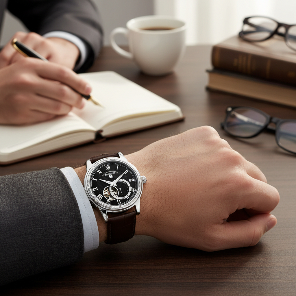 Edle Automatikuhr in elegantem Design. Dazu verleiht das Sichtfenster mit Blick auf die Unruhe und der denzentralen Sekunde dem eleganten Look der Uhr den letzten Schliff. Das braune Lederarmband mit Alligatorprägung und brauner Naht passt perfekt zum schwarzen Zifferblatt. Die silbernen Zeiger und die Indizes sind gut erkennbar. Zudem ist das Modell bis zu 5 ATM Wasserdicht und hat eine geriffelte Lünette. Die Uhr wird von einem Japanischen Automatikwerk von Miyota angetrieben. Ein aus Edelstahl gefertigtes Gehäuse rundet das vollkommene Design ab. Durch den Gehäuseboden mit Glaseinsatz kann das ganggenaue Automatikuhrwerk mit einer Gangreserve von 42 Stunden von Miyota betrachtet werden.