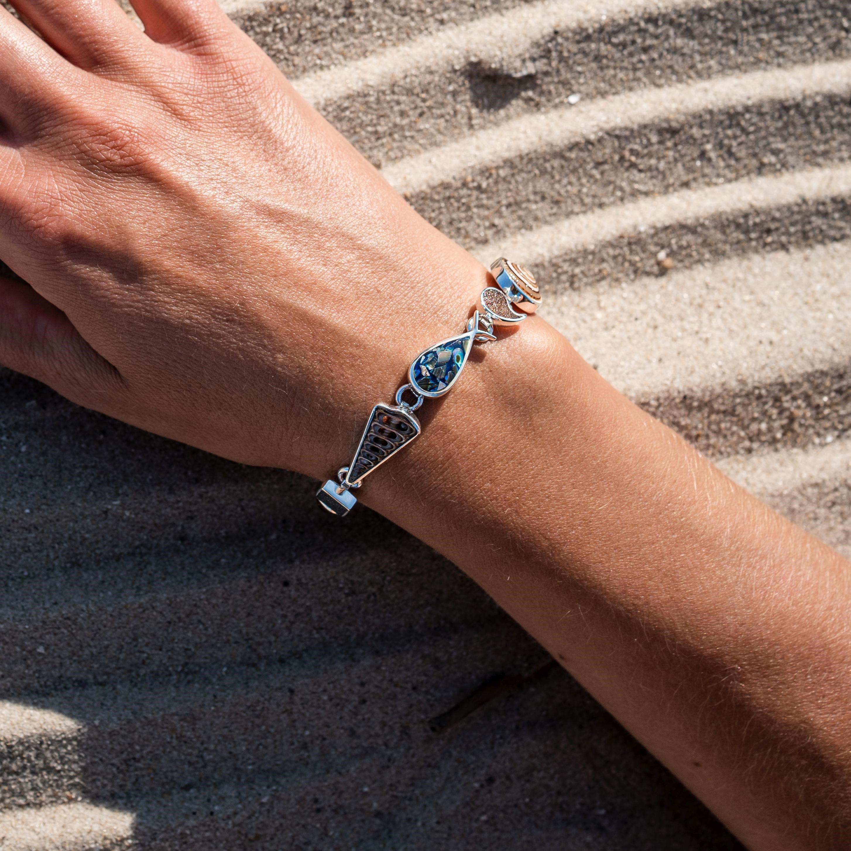 Gefertigt aus hochwertigem, rhodiniertem 925er Sterling-Silber, besticht das Armband durch sein filigranes Design und das markante Mittelstück, das in Strandsand gebettet ist. Die Länge ist flexibel verstellbar von ca. 16 bis 19 cm und passt sich somit ideal an.