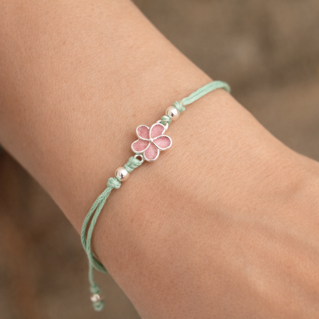 DUR Armband A1991 Plumeria Blüte – 925 Silber mit rosa Steinsand, Baumwollband mint
