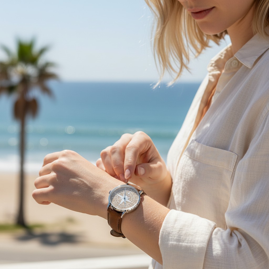 - Einzigartiges Zifferblatt mit Strandsand und Kompassrose