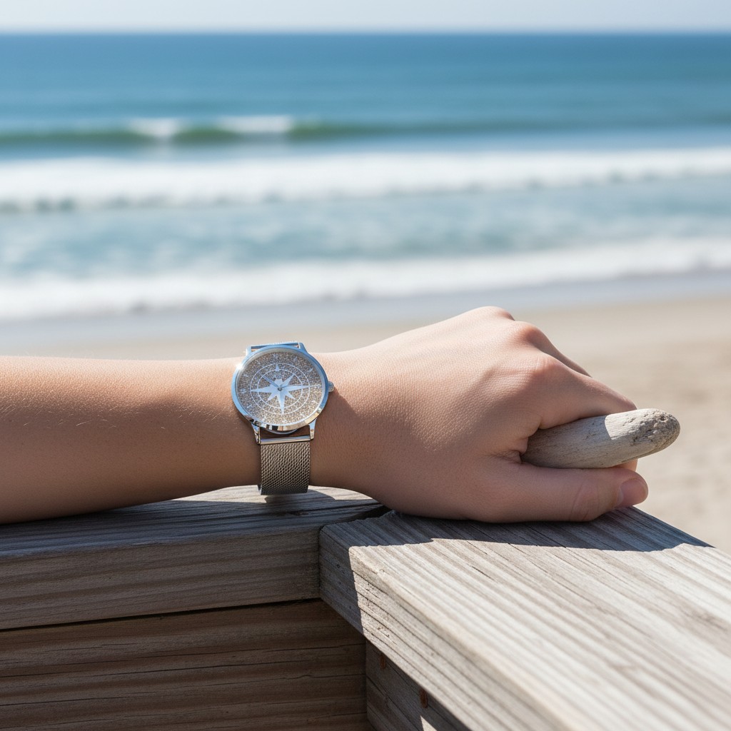 - Einzigartiges Zifferblatt mit Strandsand und Kompassrose