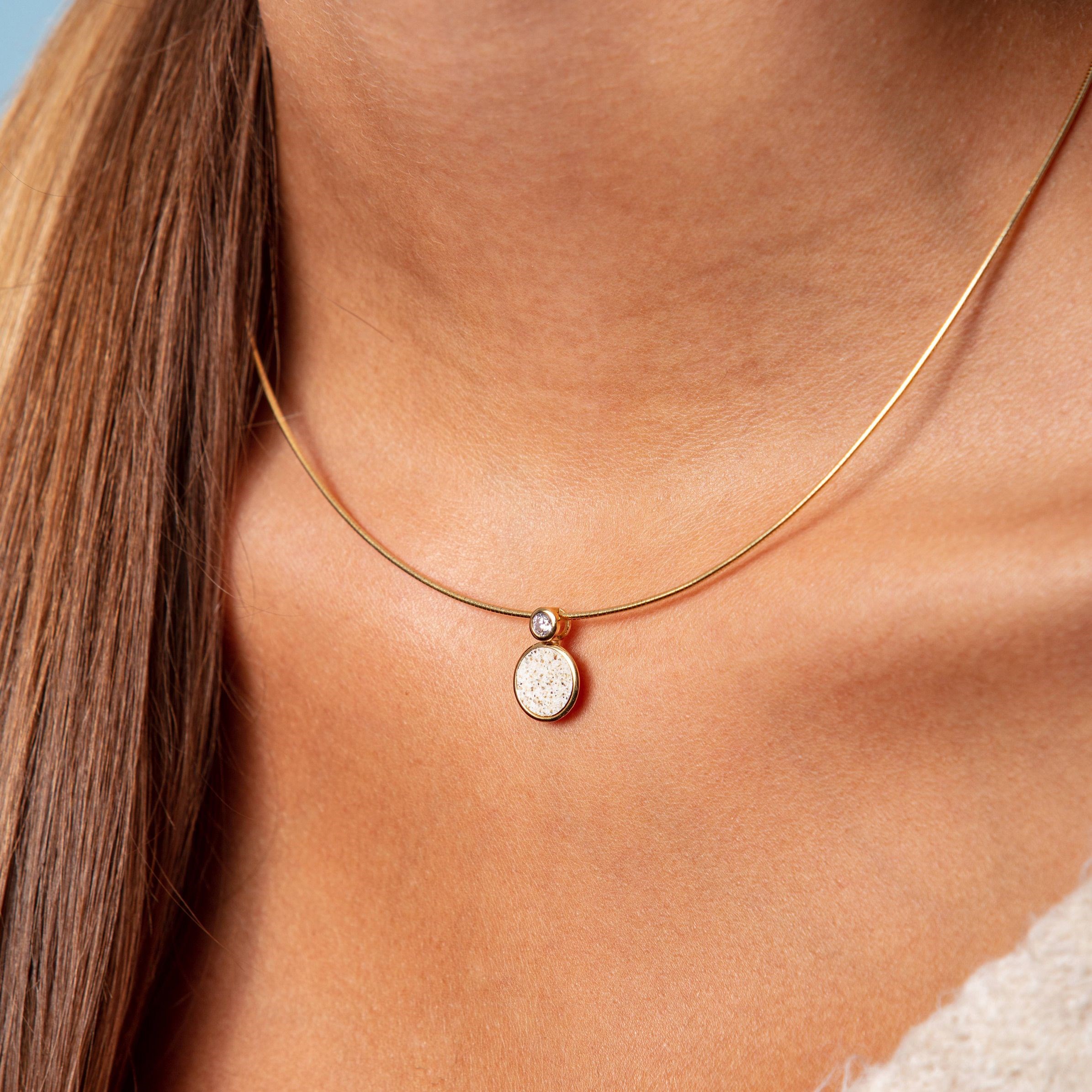 Der feine Omegareif aus vergoldetem 925er Sterling-Silber legt sich sanft um den Hals und trägt die zierliche, zweiteilige Anhängerkombination: Ein runder, mit Strandsand gefüllter Anhänger bildet die Basis, während der darüber positionierte Zirkonia den funkelnden Höhepunkt setzt. Die natürlichen Sandkristalle blitzen bei jeder Bewegung auf und erinnern an magische Momente unter einem klaren Sternenhimmel.