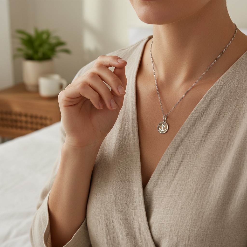 Die DUR Halskette K2666 „Anker 2.0“ ist ein filigranes, maritimes Schmuckstück mit besonderer Ausstrahlung. Der runde Anhänger mit einem Durchmesser von ca. 10 mm zeigt einen fein gearbeiteten Anker, eingebettet in echten Strandsand – ein Symbol für Halt, Hoffnung und Verbundenheit.