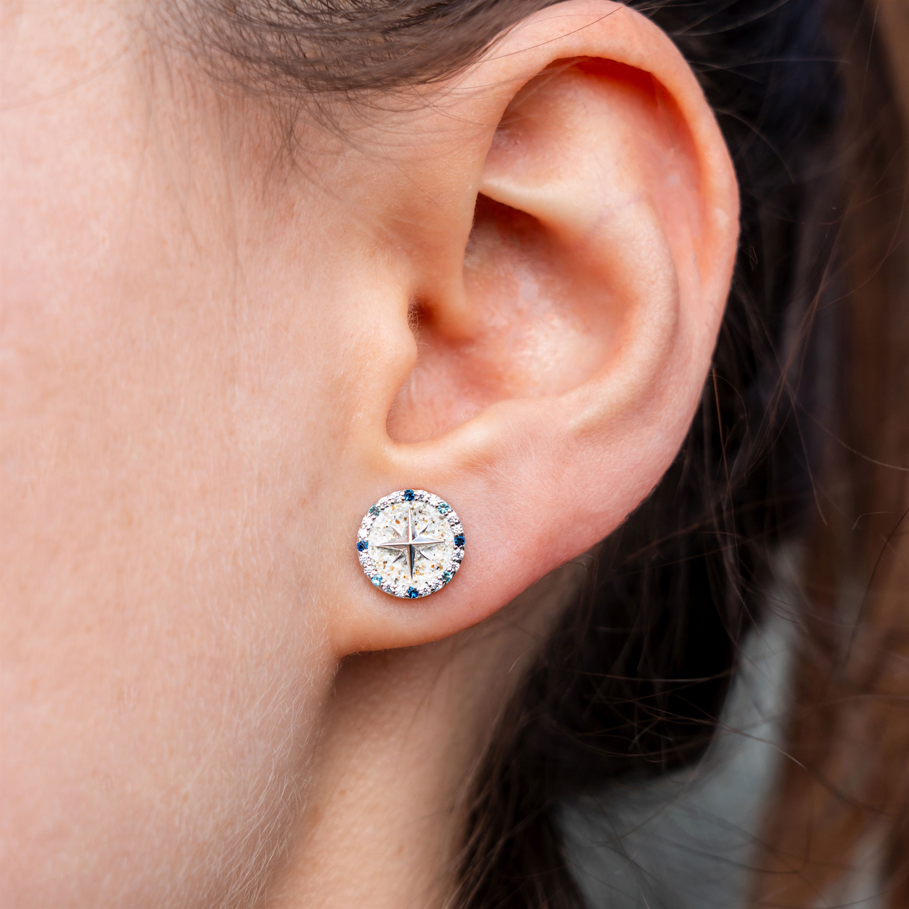 Mit ihrem harmonischen 10-mm-Format gehören die Ohrstecker zu den Stücken, die dezent wirken und dennoch alle Blicke auf sich ziehen. Der in Strandsand gebettete Mittelpunkt wird von einer fein ausgearbeiteten Kompassrose geziert – ein zeitloses Symbol für Orientierung, Mut und den eigenen Weg. Der äußere Rand ist mit facettierten Zirkoniasteinen in Weiß, Hellblau und Dunkelblau besetzt, die im Licht schimmern wie Wellen im Sonnenlicht.