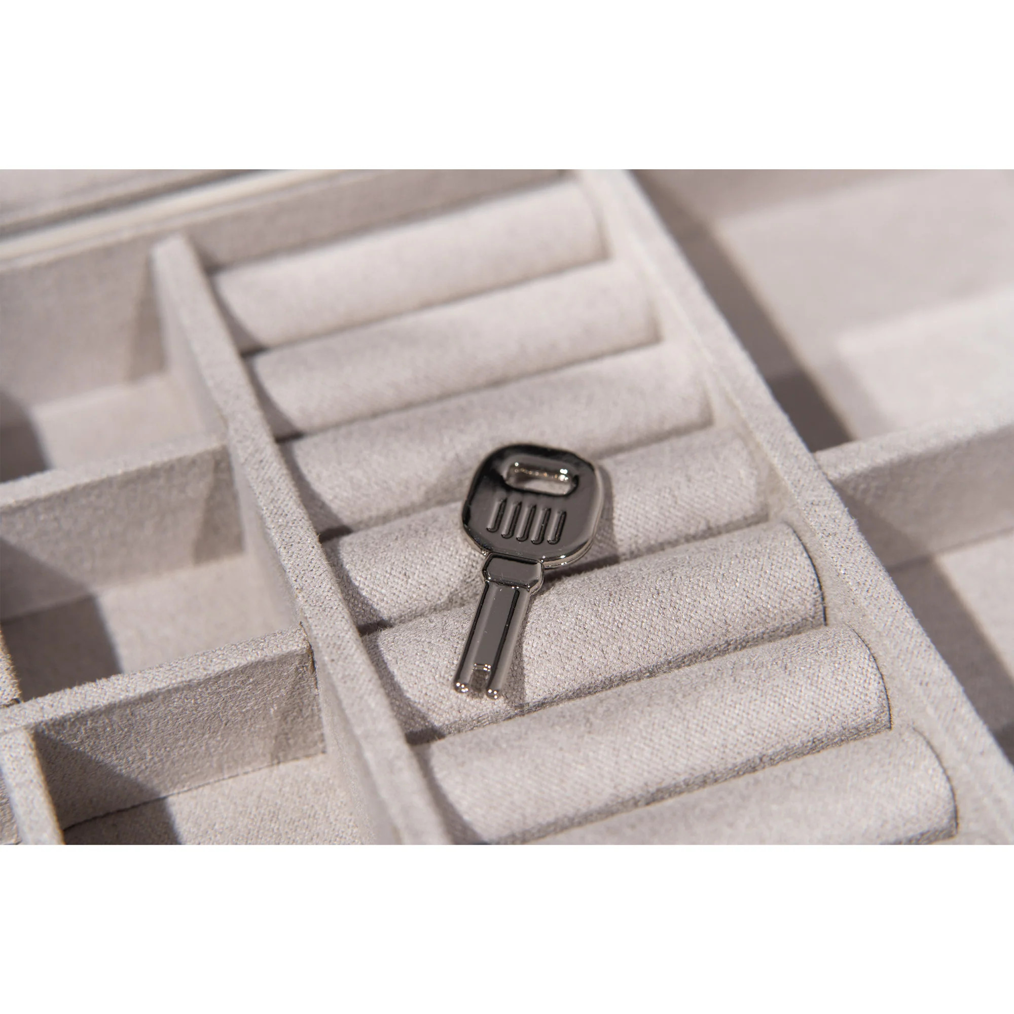 Im Inneren überzeugt der Koffer mit einem herausnehmbaren Tableau, das zahlreiche Ringfächer und Ablagen in unterschiedlichen Größen bietet. Darunter befindet sich ein großes Hauptfach mit zweifacher Unterteilung, in dem auch voluminöser Schmuck sicher verstaut werden kann. Das harmonisch abgestimmte Velours-Innenfutter schützt Ringe, Ketten, Ohrringe und Armbänder zuverlässig vor Kratzern.