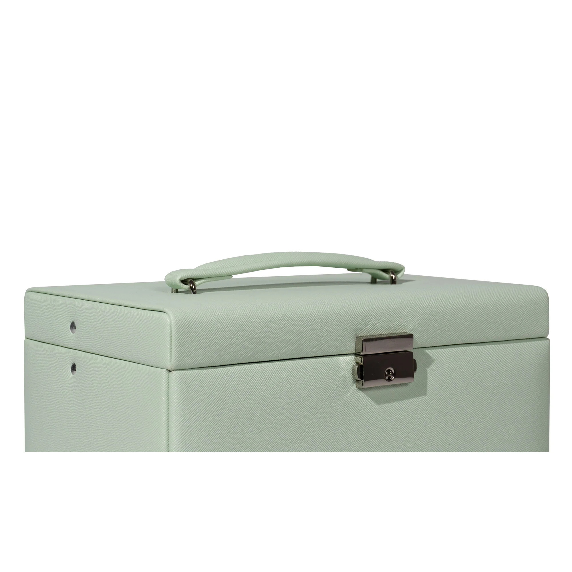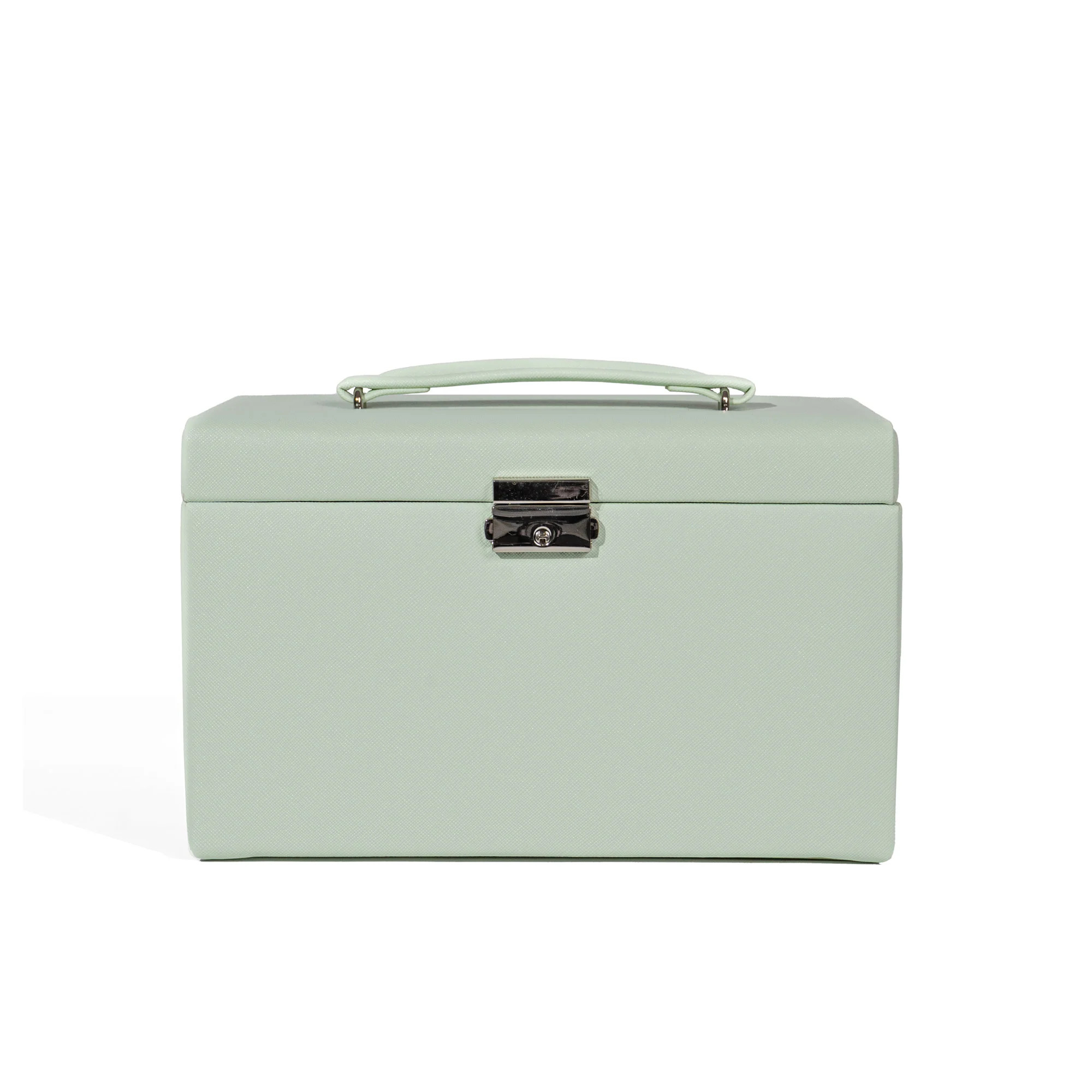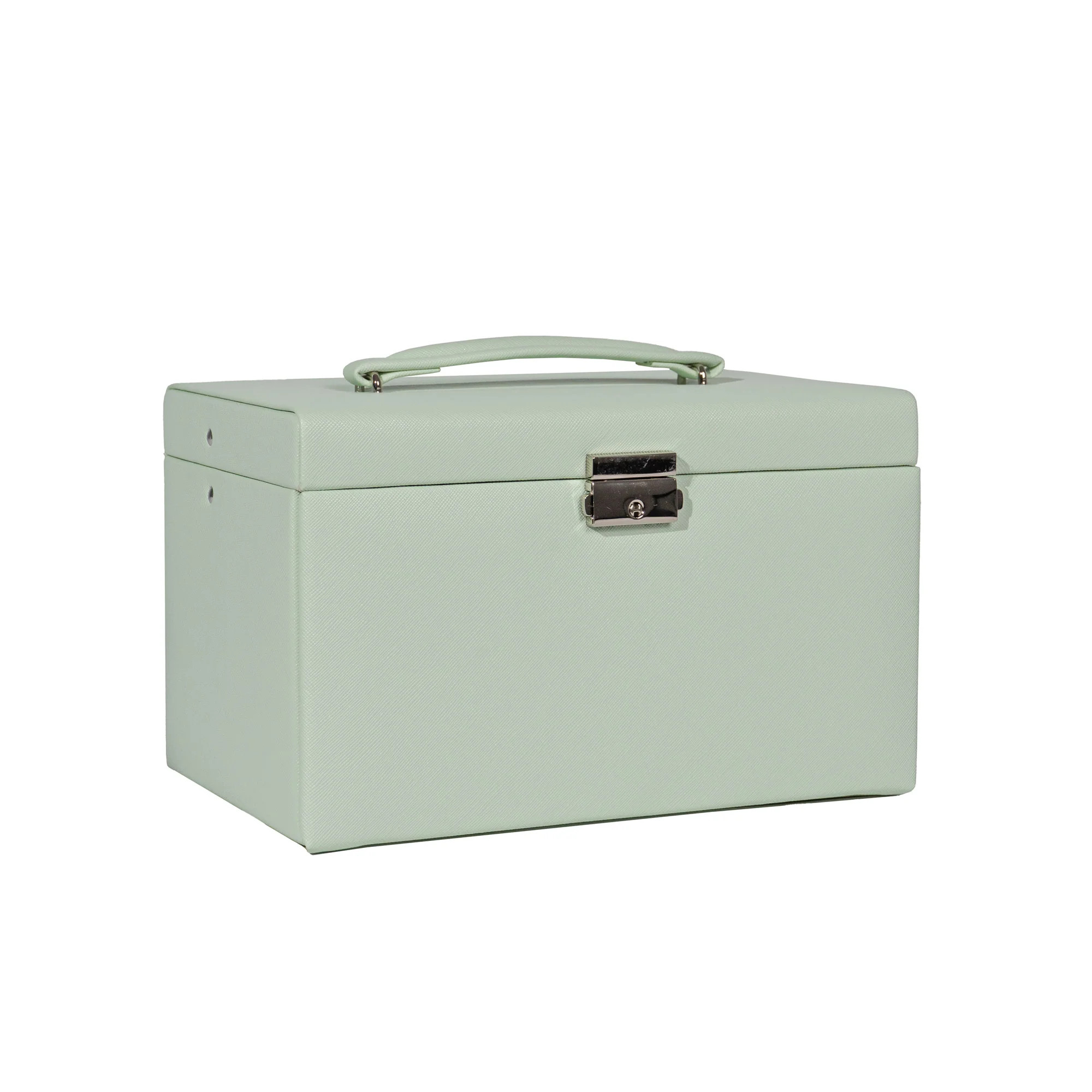 Dank abschließbarem Schloss und praktischem Tragegriff eignet sich der Schmuckkoffer ideal für die sichere Aufbewahrung zuhause oder den Transport auf Reisen.