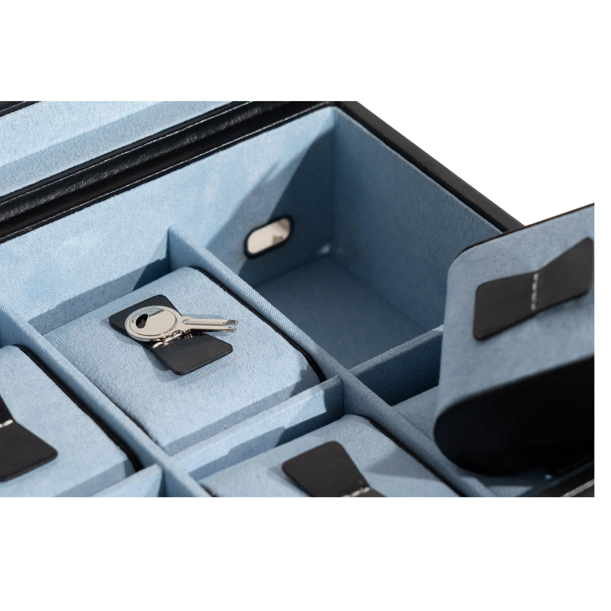 Das weiche Velours-Innenfutter schützt Ihre Uhren zuverlässig vor Kratzern. Zehn Uhrenkissen mit den Maßen 5 × 7 × 3 cm bieten stabilen Halt für unterschiedlich große Modelle. Eine praktische Rüschentasche im Deckel ermöglicht zusätzlichen Stauraum, z. B. für Armbänder oder Uhrenglieder. Für maximale Sicherheit lässt sich die Uhrenbox abschließen.