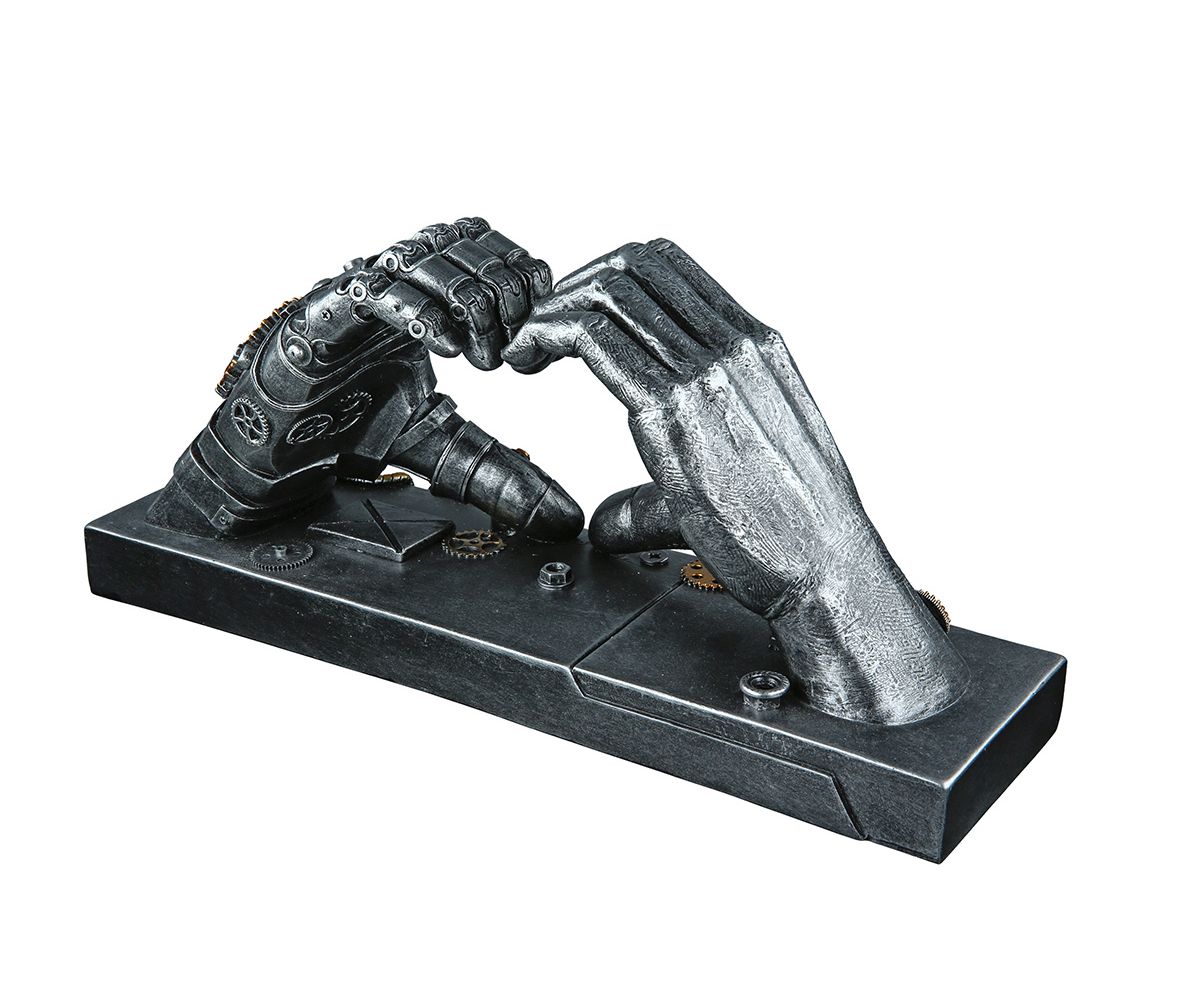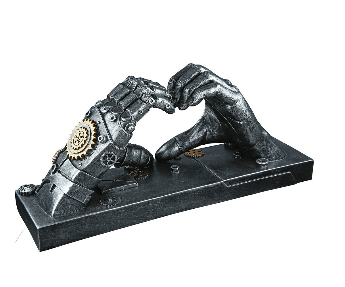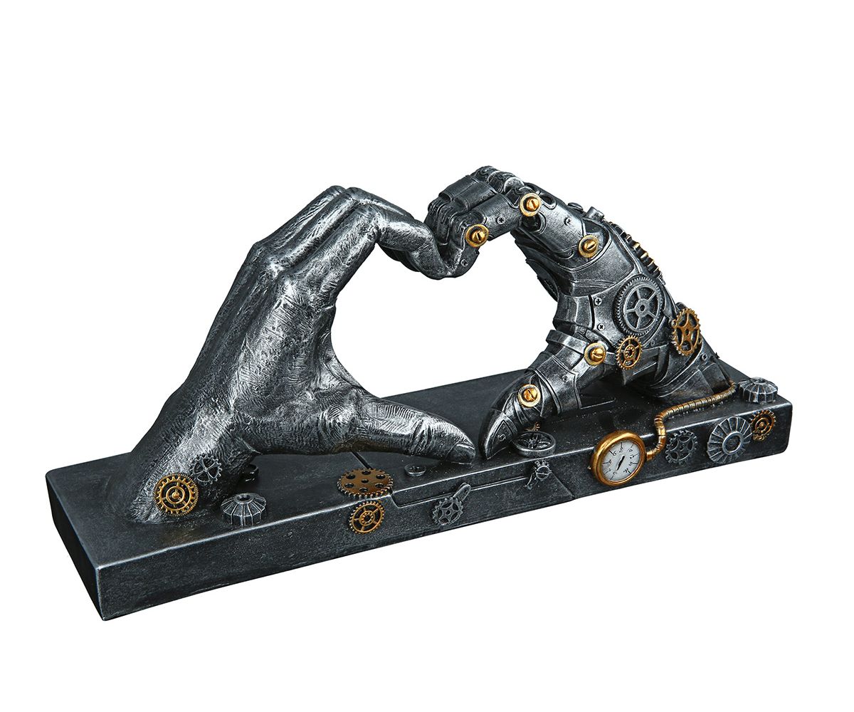 Das Dekoobjekt „Steampunk Hand“ von Gilde (Modell 37049) verbindet moderne Kunst mit Technik-Ästhetik. Die Figur zeigt ein stilisiertes Herz, das von einer mechanisch anmutenden Hand im Steampunk-Stil gehalten wird – dekoriert mit Zahnrädern und Metalloptik.
