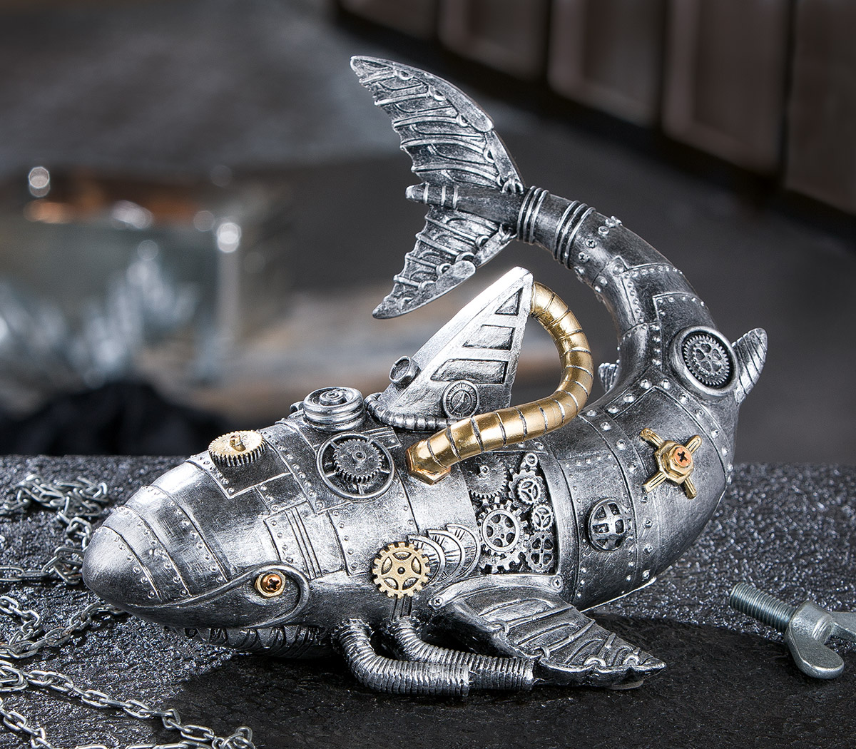 Das Gilde Dekoobjekt „Steampunk Shark“ ist eine ideale Geschenkidee für Liebhaber von außergewöhnlichem Design, Steampunk-Ästhetik und maritimen Motiven.
