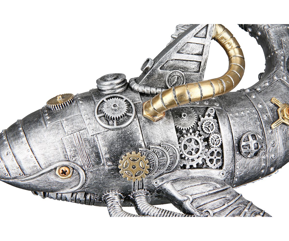 Das Gilde Dekoobjekt „Steampunk Shark“ ist eine kreative Kombination aus Tiermotiv und mechanischem Design. Die detailreich gestaltete Hai-Figur im Steampunk-Stil begeistert mit technischen Elementen und einem markanten Antikfinish.