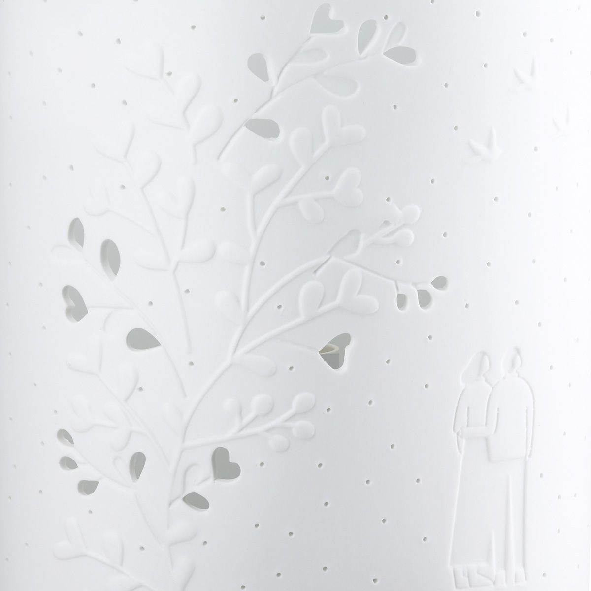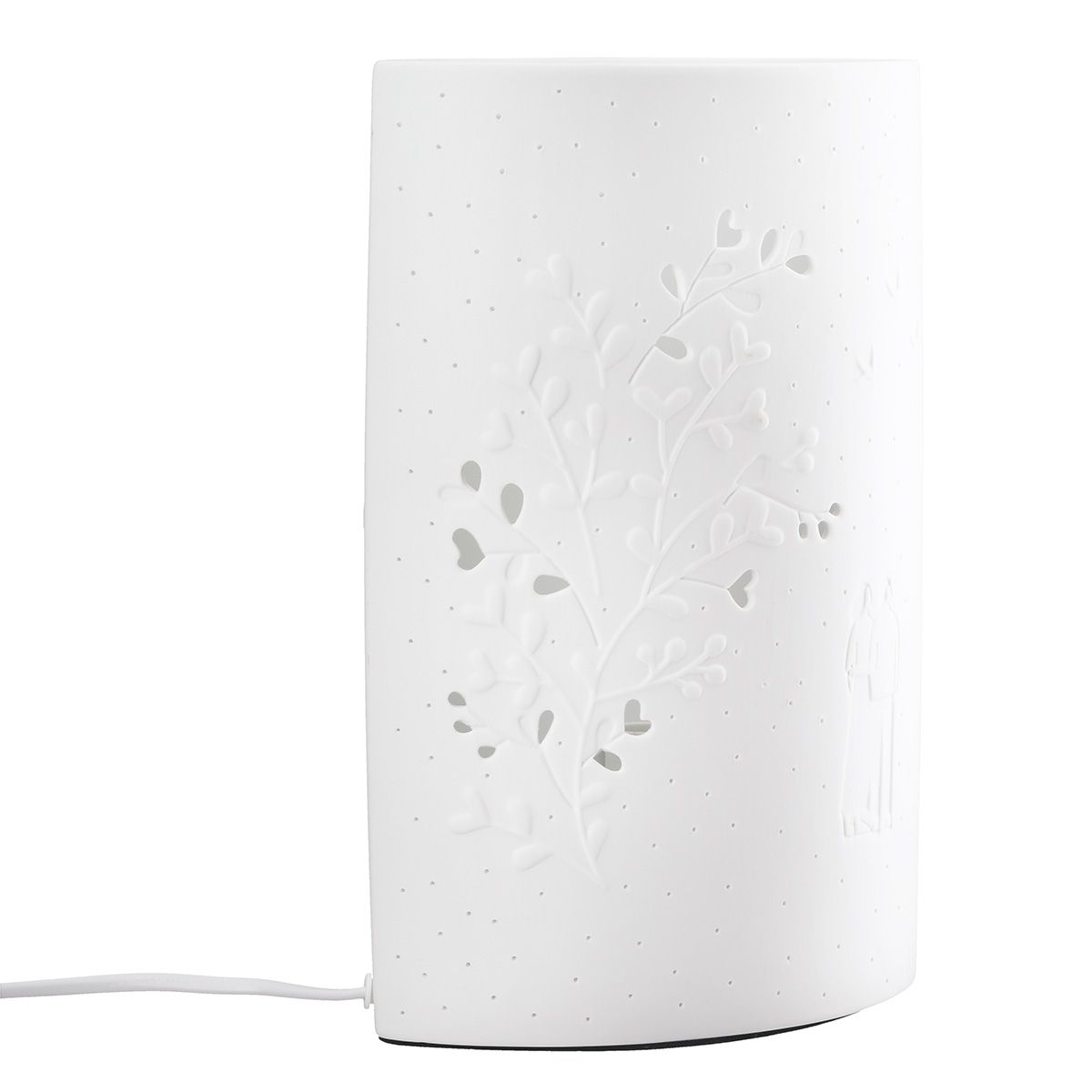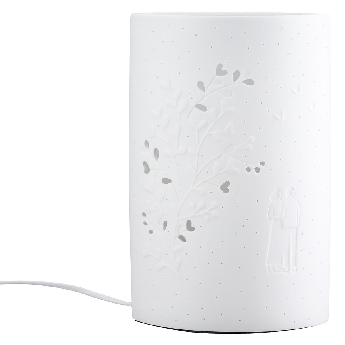 Die Tischleuchte „Moments“ von Gilde (Modell 60837) überzeugt mit einem einseitig gestalteten Design aus edlem weißem Porzellan. Das filigrane Motiv zeigt ein Paar und einen Zweig mit Herzen, durch die das Licht sanft hindurchscheint – ideal für stimmungsvolle Lichtakzente im Raum.