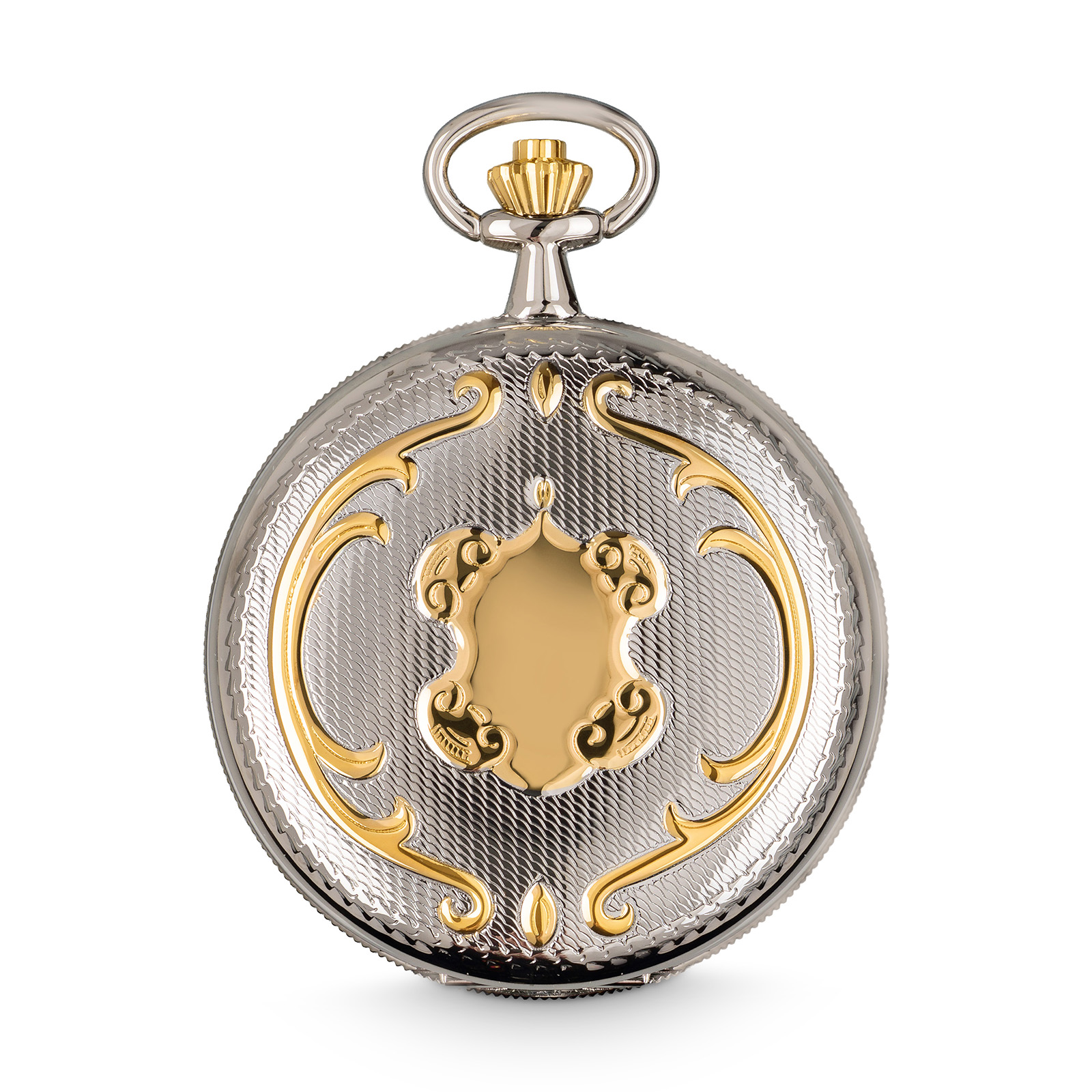 Die Hermann Jäckle Skelett-Taschenuhr „Augsburg II“ verbindet traditionelle Uhrmacherkunst mit einer markanten Gestaltung. Das skelettierte Handaufzugswerk Kal. 2650 wird durch beidseitiges Mineralglas eindrucksvoll sichtbar und macht die feine Mechanik zum Blickfang. Das hochwertig verchromte, bicolor gestaltete Messinggehäuse mit goldfarben IP-beschichteter Lünette unterstreicht den klassischen Charakter. Im Unterschied zur Augsburg befindet sich die Krone bei dieser Variante auf 3 Uhr – eine Anordnung im Stil historischer Savonette-Modelle. Mit 50 mm Durchmesser ist sie ein ausdrucksstarker Zeitmesser für Liebhaber mechanischer Tradition.