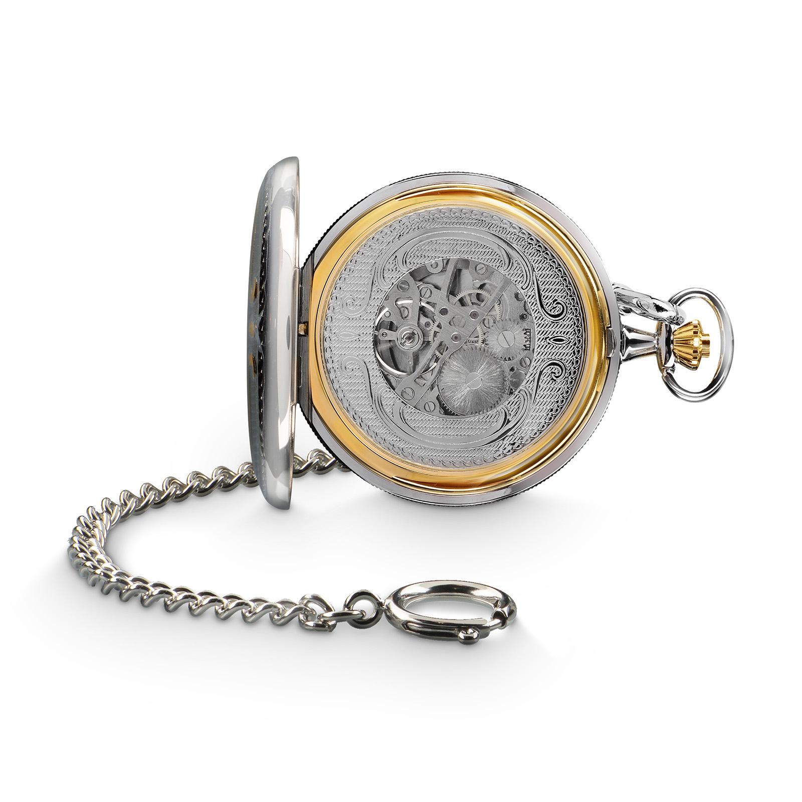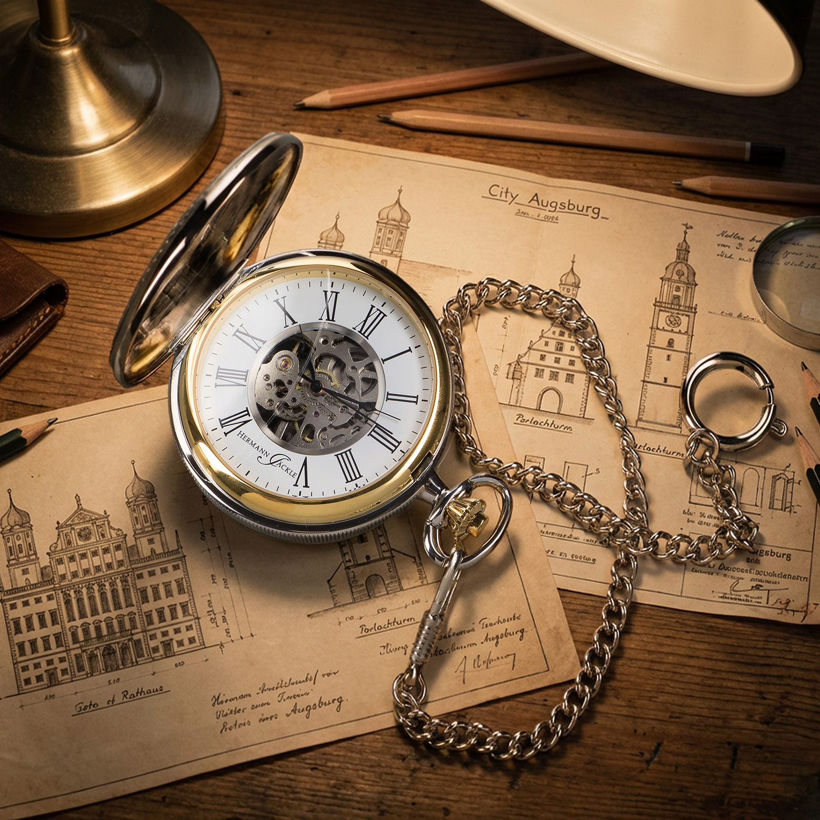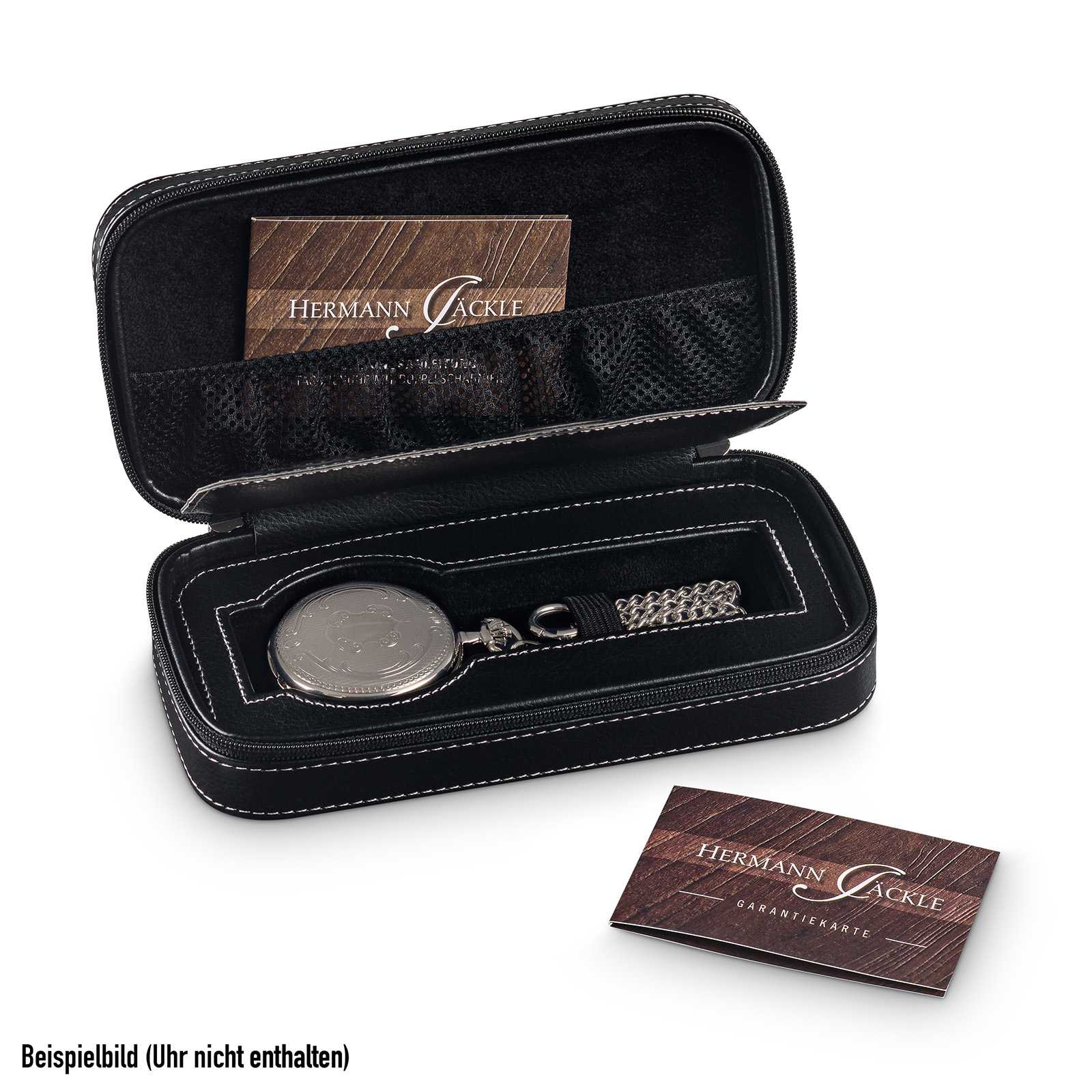 Produktinformationen "Hermann Jäckle Augsburg II Skelett-Taschenuhr Handaufzug Mineralglas Kette & Reiseetui 50 mm"