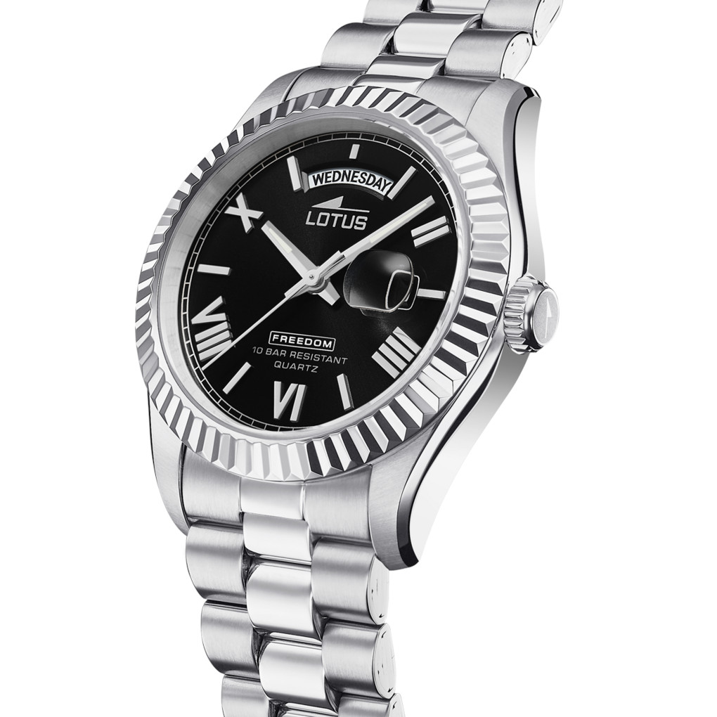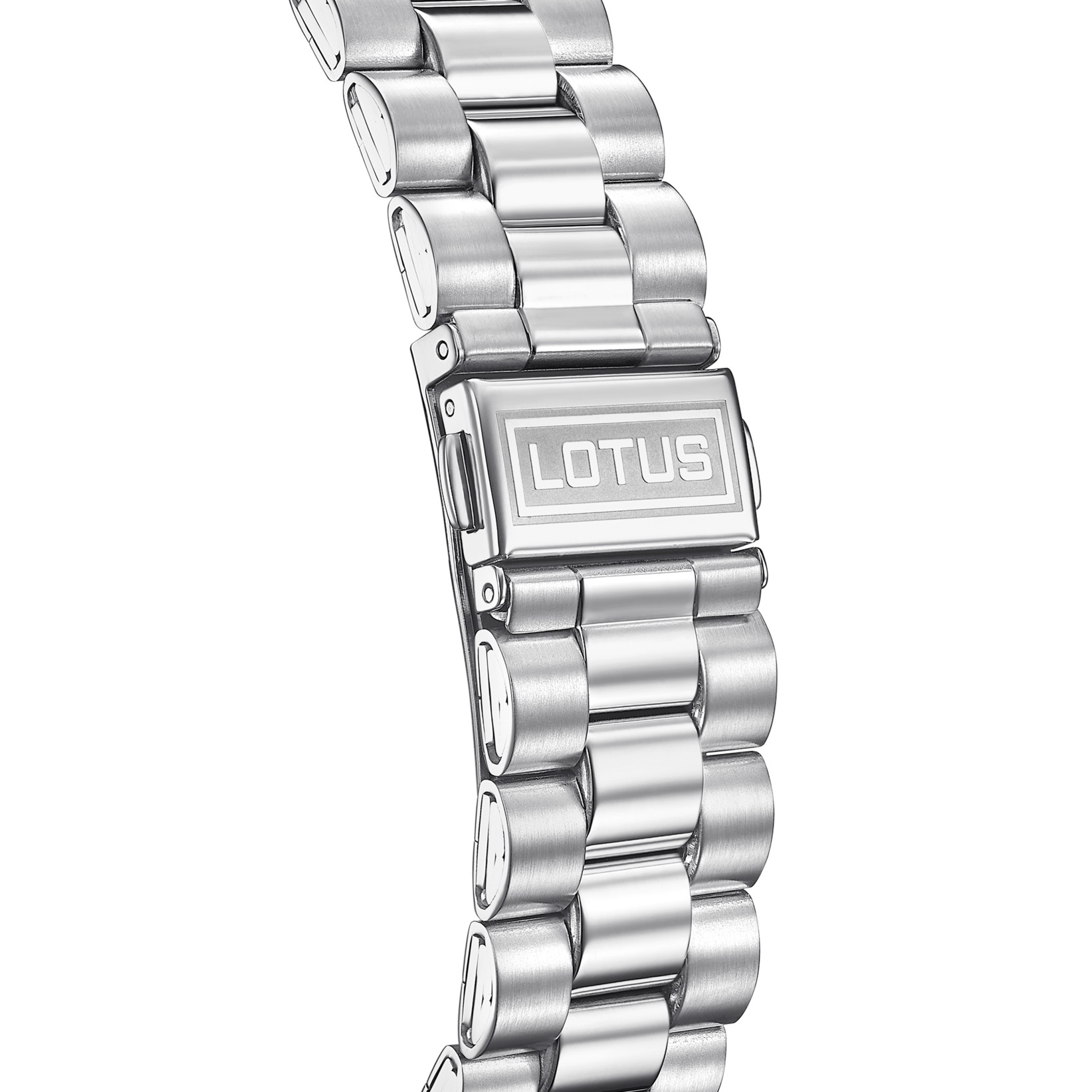 Die Lotus 18854-4 präsentiert sich mit einem tiefschwarzen Zifferblatt, das dem Design eine ruhige, kraftvolle Ausstrahlung verleiht. Das Edelstahlgehäuse und das passende Edelstahlband unterstreichen den sportlich-eleganten Charakter der Uhr und sorgen für einen sicheren, angenehmen Sitz. Mit einem Gehäusedurchmesser von 41,5 mm wirkt der Zeitmesser präsent, bleibt dabei jedoch ausgewogen und vielseitig tragbar. Ein Modell, das zeitlose Optik und moderne Alltagstauglichkeit gekonnt vereint.