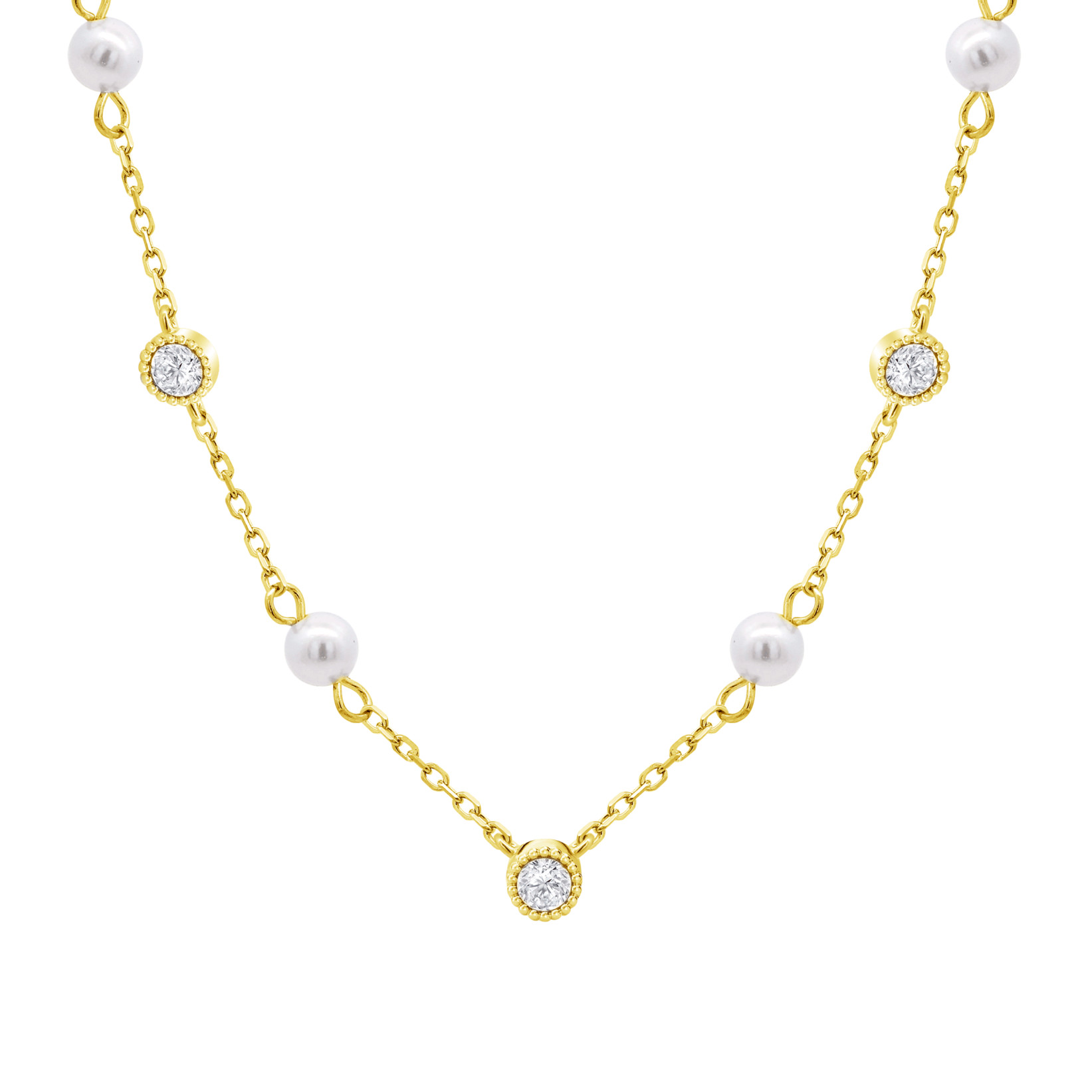 Die Kette ist mit 3 Zirkonia (je ca. 3 mm) und 4 weißen synthetischen Perlen (je ca. 4 mm) besetzt und bietet ein ausgewogenes, stilvolles Gesamtbild. Mit einem Gewicht von ca. 2,6 Gramm ist sie angenehm leicht zu tragen.