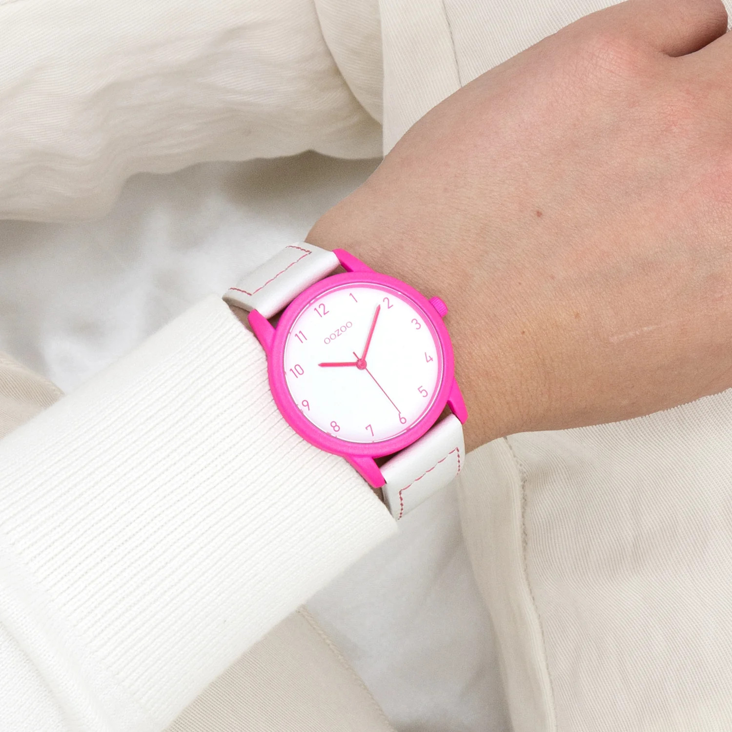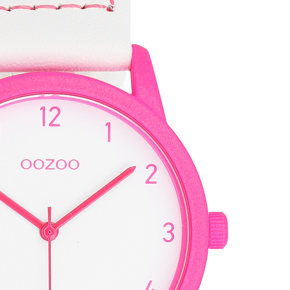 Die OOZOO Uhr überzeugt durch ihre klare Gestaltung und ihre moderne Farbgebung. Die Kombination aus Weiß und Pink wirkt frisch und feminin, während die mittlere Gehäusegröße eine angenehme Tragbarkeit garantiert.