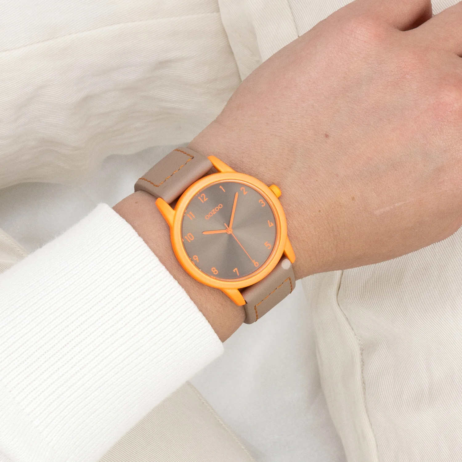 - Zifferblatt: Taupe, Indexe und Zeiger orange