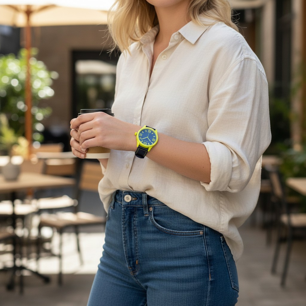 Die OOZOO Uhr überzeugt durch ihre klare Linienführung und das Zusammenspiel kräftiger Farben. Das große Gehäuse sorgt für eine markante Präsenz, während die harmonische Farbkombination aus Blau und Gelb für einen modernen Look steht.