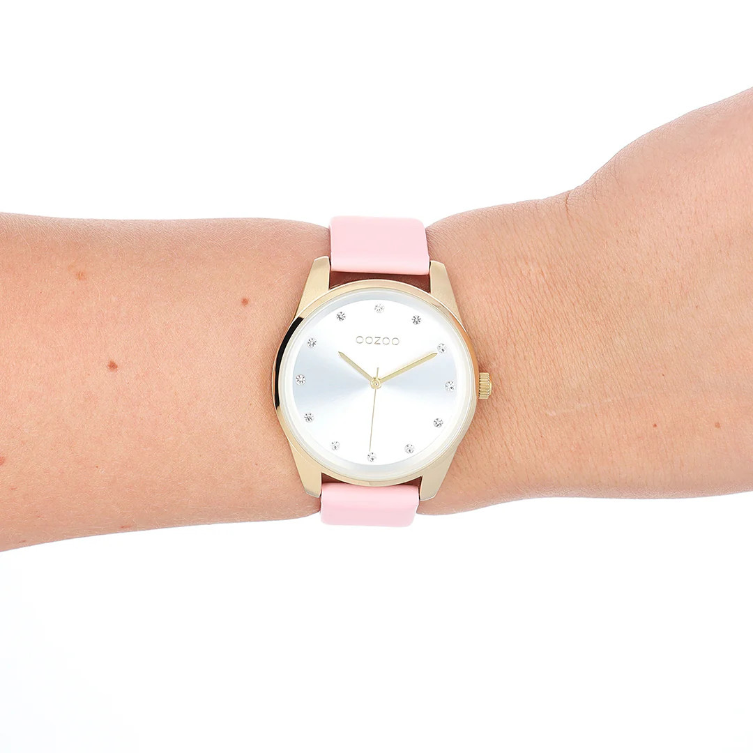 Die Oozoo Damenuhr C11045 kombiniert ein edles IP-Gold-Gehäuse mit einem zarten rosa Lederarmband. Das silberfarbene Zifferblatt wird von funkelnden Zirkonia veredelt und sorgt für einen stilvollen Auftritt – perfekt für jede Gelegenheit.