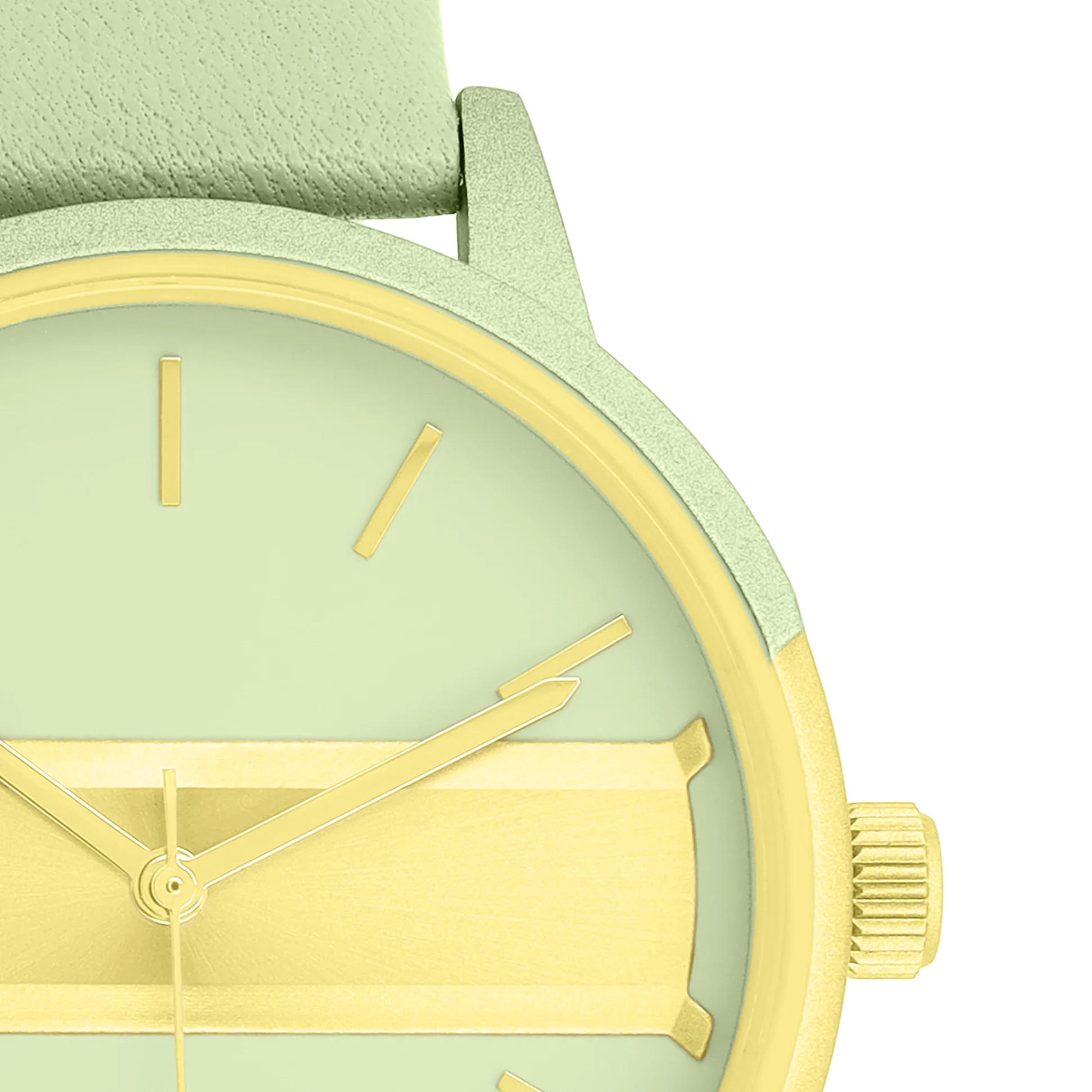 - Metallgehäuse hellgrün/goldfarben IP-beschichtet matt, Edelstahlboden verpresst, Krone gerändelt