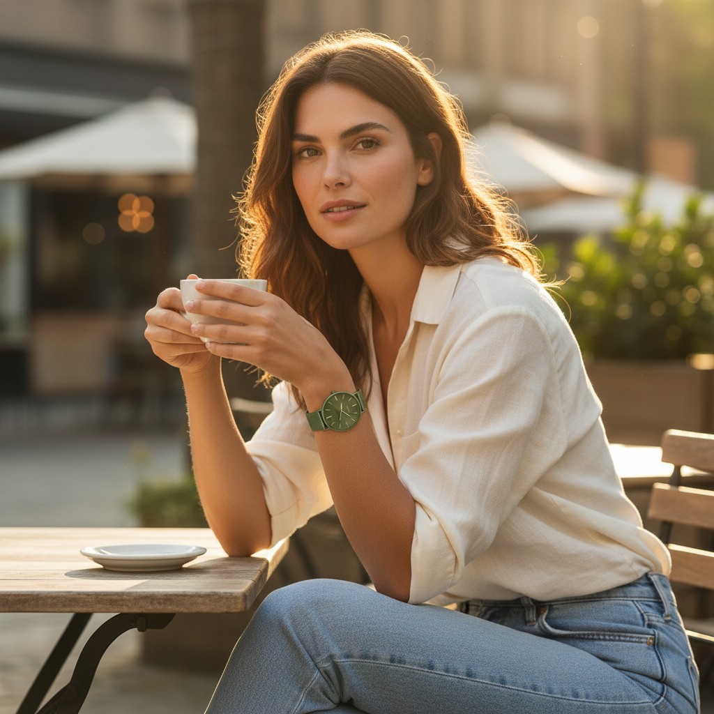 Das khakigrüne Zifferblatt mit edlem Sonnenschliff setzt zusammen mit goldfarbenen Zeigern und Indexen stilvolle Akzente. Das farblich abgestimmte Milanaiseband mit verstellbarer Clipschließe sorgt für einen harmonischen Gesamtlook und angenehmen Tragekomfort.
