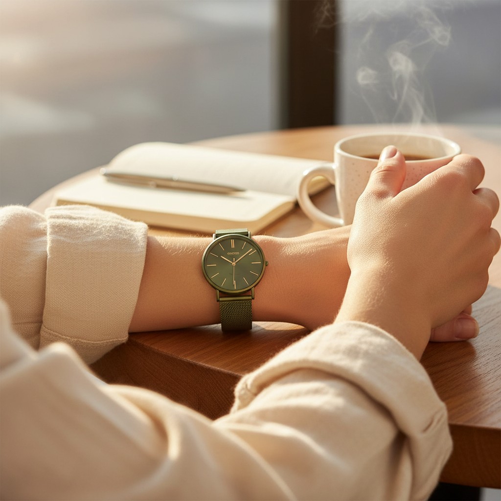 Die Oozoo Vintage Damenuhr C20445 vereint zarte Größe mit trendbewusstem Design. Das 36 mm Metallgehäuse in matt khakigrüner IP-Beschichtung wirkt modern und zugleich zeitlos – perfekt für stilvolle Alltagslooks.