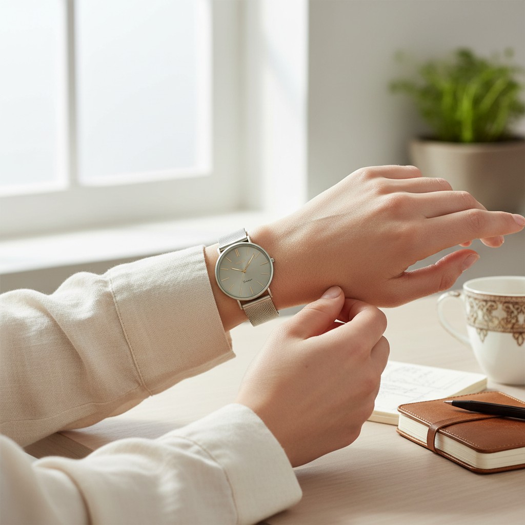 Ein modischer Zeitmesser für Frauen, die dezente Farben und feine Details lieben.