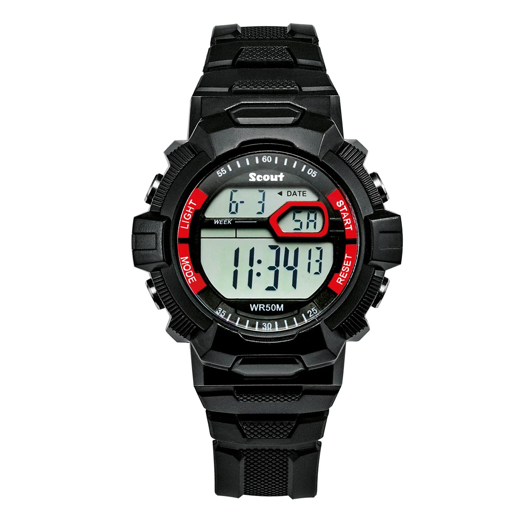 Die Scout Digitaluhr überzeugt durch ihre Kombination aus Funktionalität und robustem Design. Das widerstandsfähige Kunststoffgehäuse sorgt für Stabilität, während das leichte Gewicht einen angenehmen Tragekomfort garantiert.