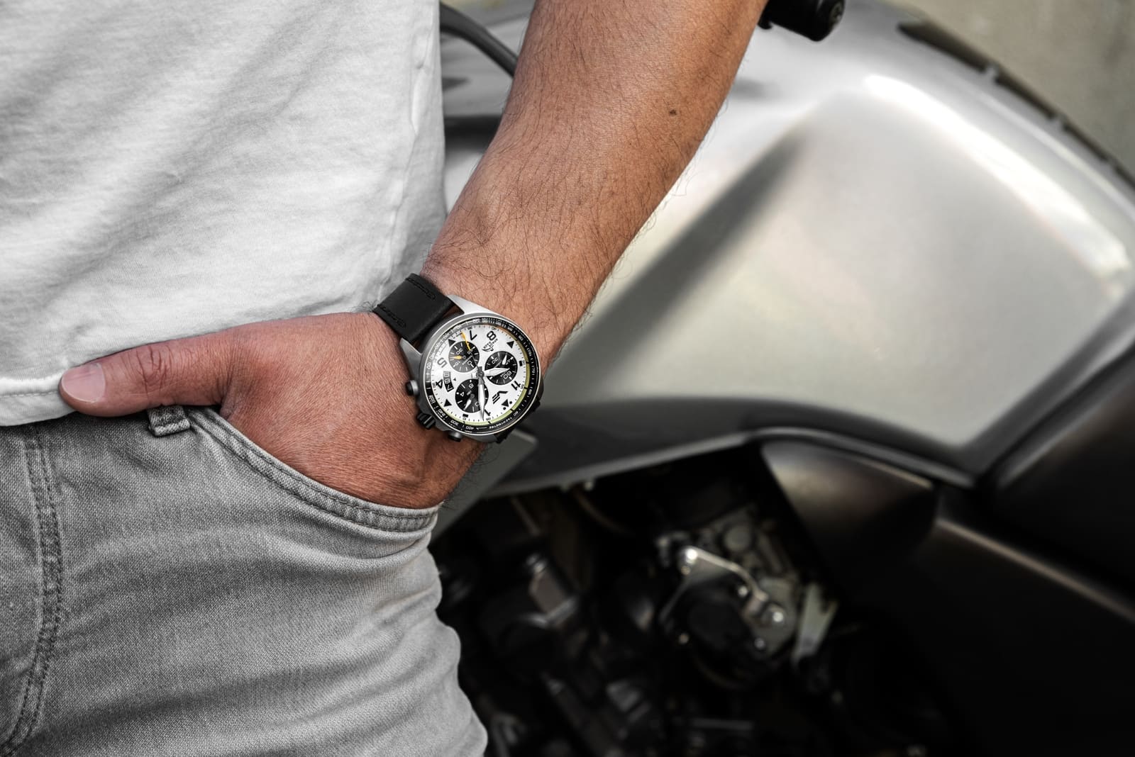 - Der zentrale Chronograph bewegt sich in 1/4 Sekunden-Schritten und erzeugt eine nahezu flüssige Bewegung