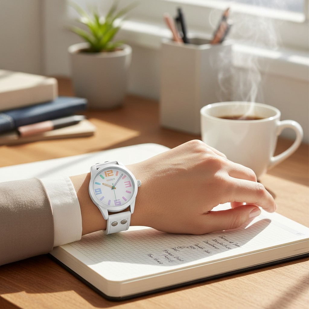 - Zifferblatt weiß mit bunten Zahlen und Indexen