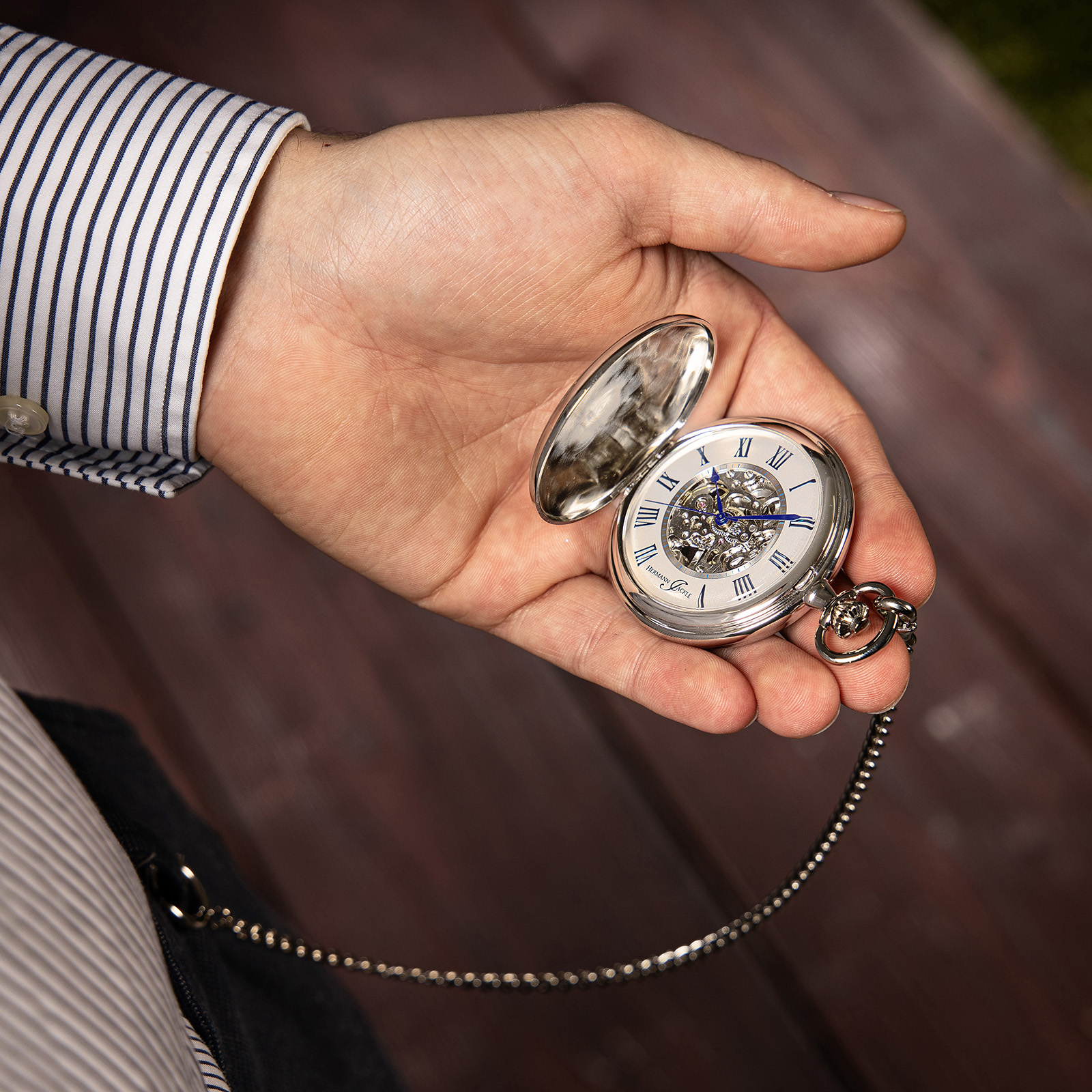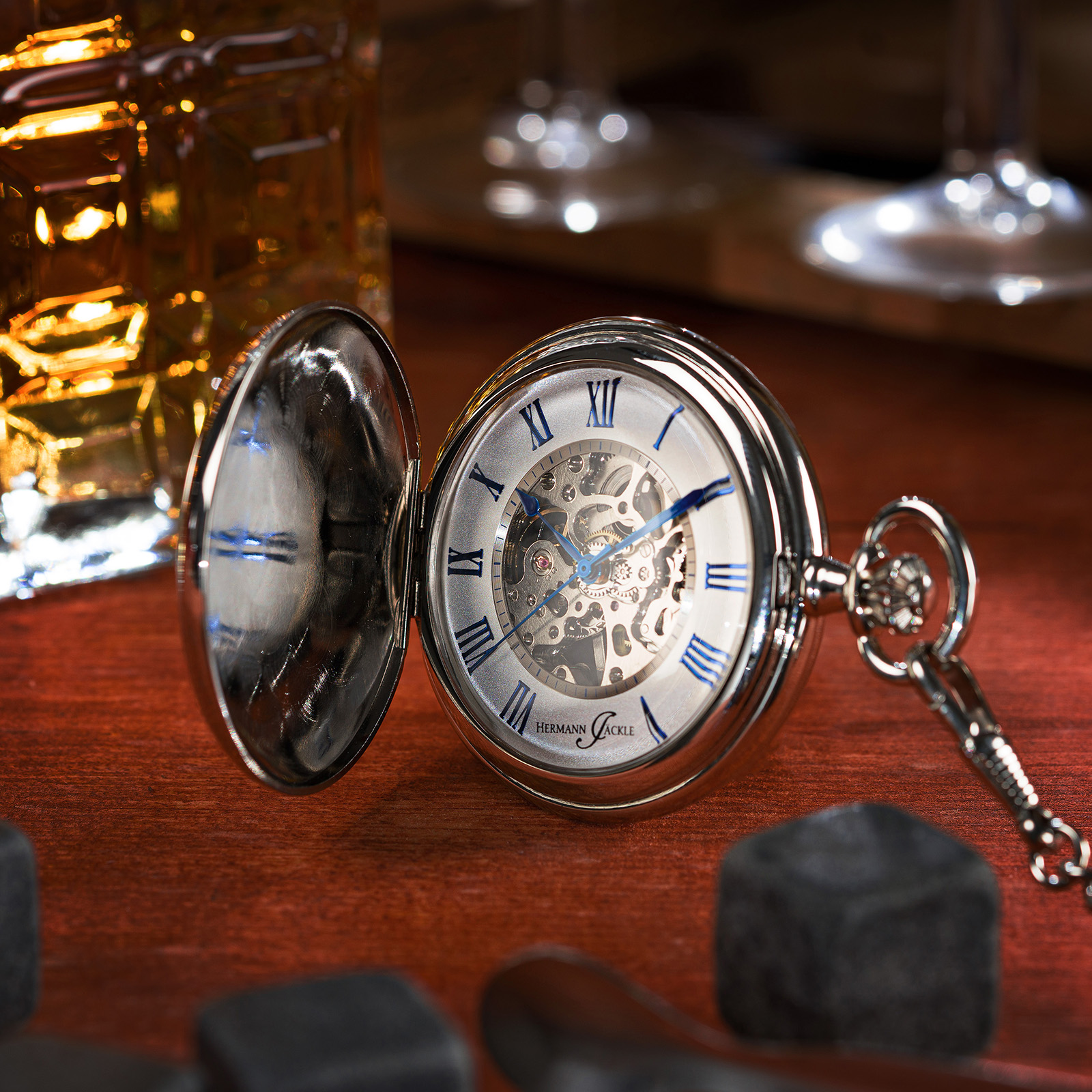 Entdecke die Hermann Jäckle Ettlingen Skelett Taschenuhr: Mineralglas, Handaufzug, filigranes Design und zeitlose Eleganz. Komplett mit stilvoller Kette und praktischem Reiseetui – dein Statement für Klasse und Stil, egal wohin dich die Zeit führt.