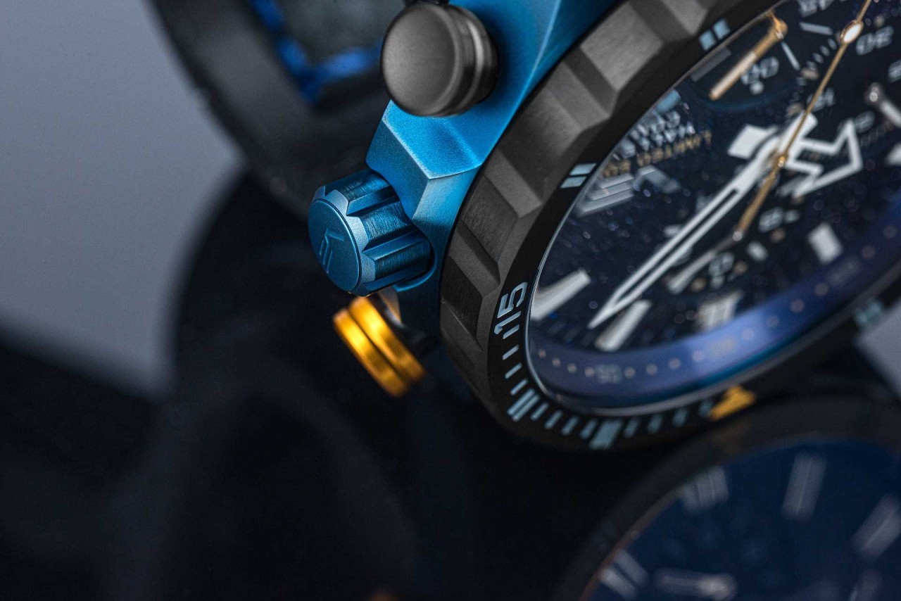 Das robuste Edelstahlgehäuse mit blauer PVD-Beschichtung sowie die farblich abgestimmten Drücker und die Lünette unterstreichen den markanten Charakter dieses Chronographen.